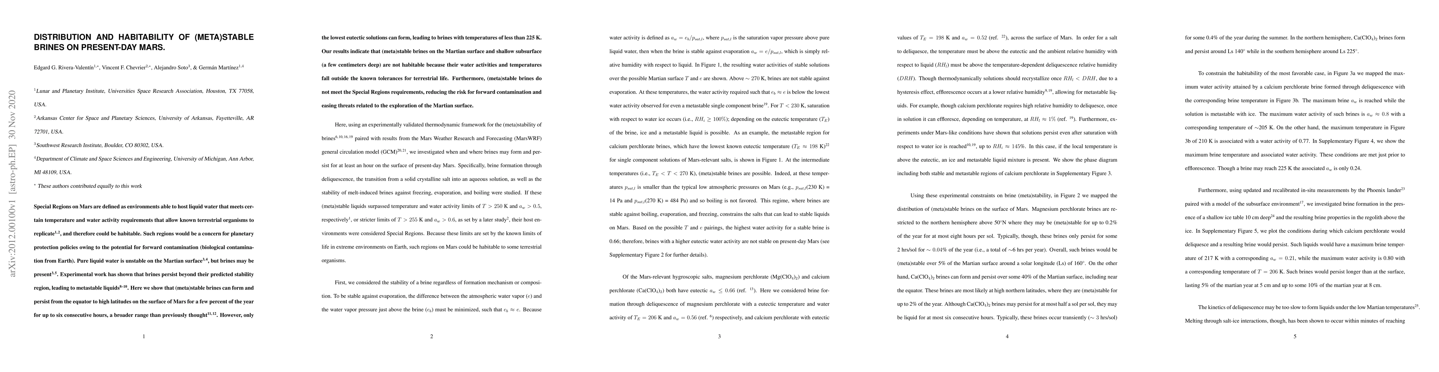 This paper investigates the formation and persistence of (meta)stable brines on Mars, finding they can exist at various latitudes for short periods but remain non-habitable due to low temperatures and water activity levels, thus reducing the risk of forward contamination from Earth.