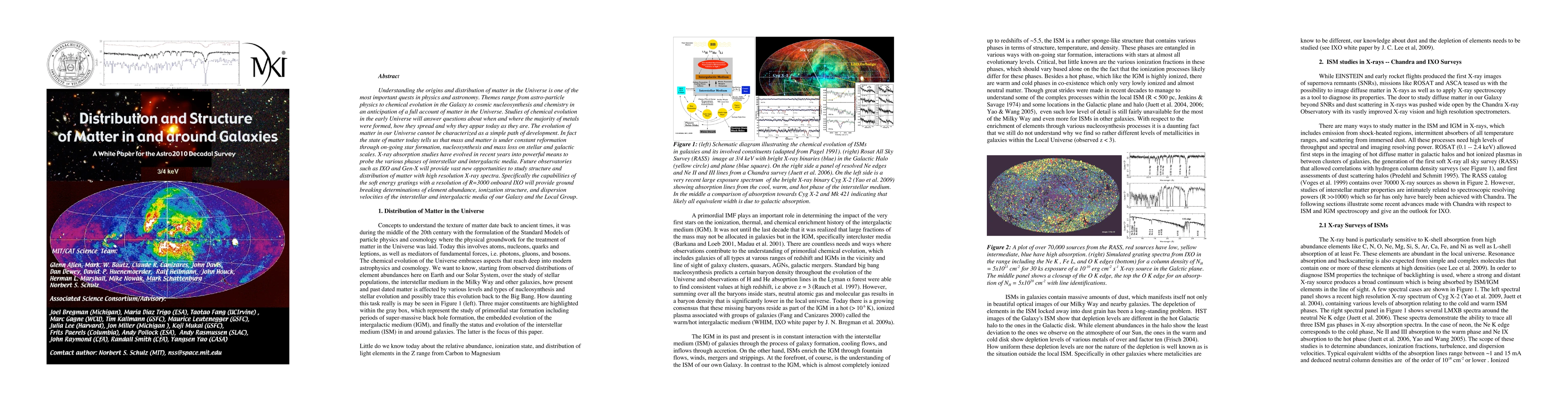 Understanding the origins and distribution of matter in the Universe is one of the most important quests in physics and astronomy. Themes range from astro-particle physics to chemical evolution in the Galaxy to cosmic nucleosynthesis and chemistry in an anticipation of a full account of matter in the Universe. Studies of chemical evolution in the early Universe will answer questions about when and where the majority of metals were formed, how they spread and why they appar today as they are. The evolution of matter in our Universe cannot be characterized as a simple path of development. In fact the state of matter today tells us that mass and matter is under constant reformation through on-going star formation, nucleosynthesis and mass loss on stellar and galactic scales. X-ray absorption studies have evolved in recent years into powerful means to probe the various phases of interstellar and intergalactic media. Future observatories such as IXO and Gen-X will provide vast new opportunities to study structure and distribution of matter with high resolution X-ray spectra. Specifically the capabilities of the soft energy gratings with a resolution of R=3000 onboard IXO will provide ground breaking determinations of element abundance, ionization structure, and dispersion velocities of the interstellar and intergalactic media of our Galaxy and the Local Group