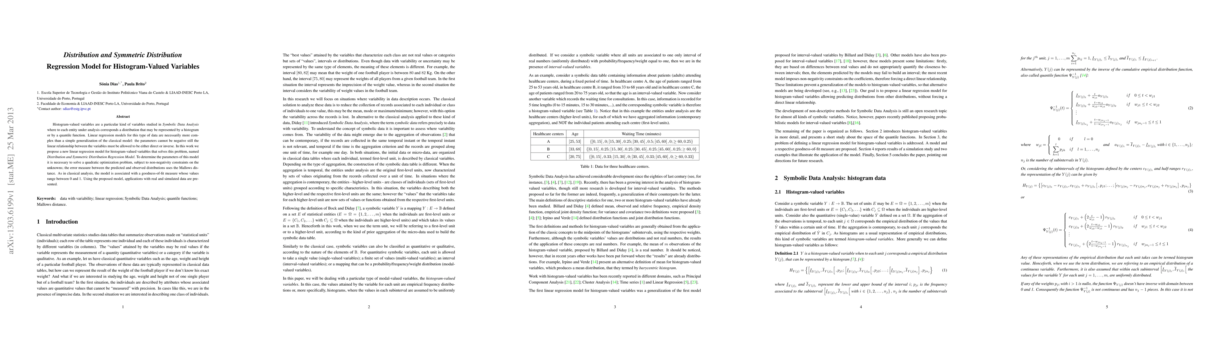 This paper proposes a new linear regression model, the Distribution and Symmetric Distribution Regression Model, for histogram-valued variables, addressing the complexity of non-negative parameters and the need for both direct and inverse linear relationships. The model is optimized using a quadratic optimization problem with non-negativity constraints and employs the Mallows distance for error measurement.