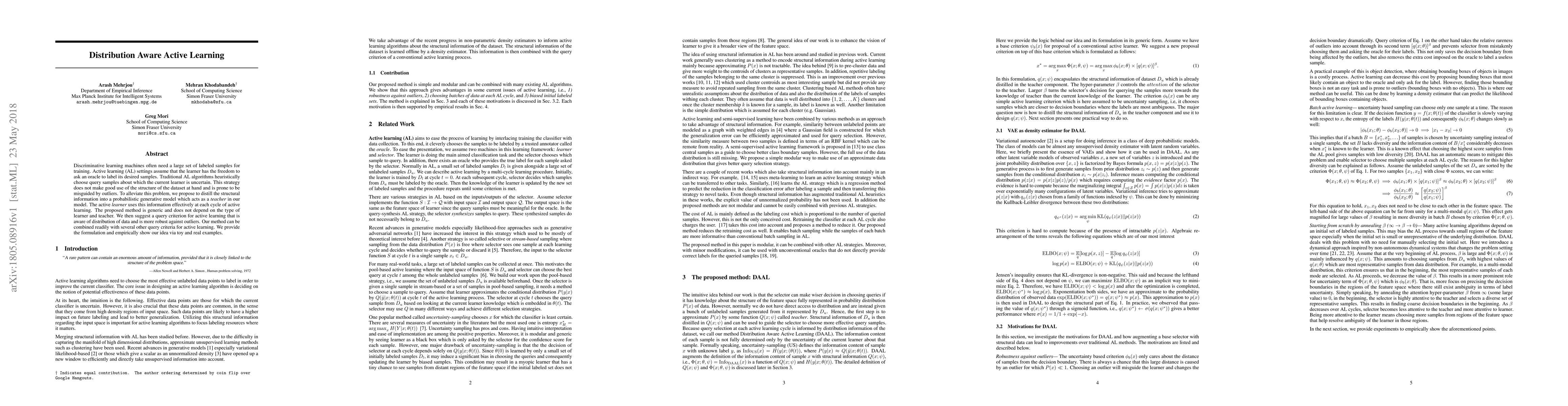 Discriminative learning machines often need a large set of labeled samples for training. Active learning (AL) settings assume that the learner has the freedom to ask an oracle to label its desired samples. Traditional AL algorithms heuristically choose query samples about which the current learner is uncertain. This strategy does not make good use of the structure of the dataset at hand and is prone to be misguided by outliers. To alleviate this problem, we propose to distill the structural information into a probabilistic generative model which acts as a \emph{teacher} in our model. The active \emph{learner} uses this information effectively at each cycle of active learning. The proposed method is generic and does not depend on the type of learner and teacher. We then suggest a query criterion for active learning that is aware of distribution of data and is more robust against outliers. Our method can be combined readily with several other query criteria for active learning. We provide the formulation and empirically show our idea via toy and real examples.