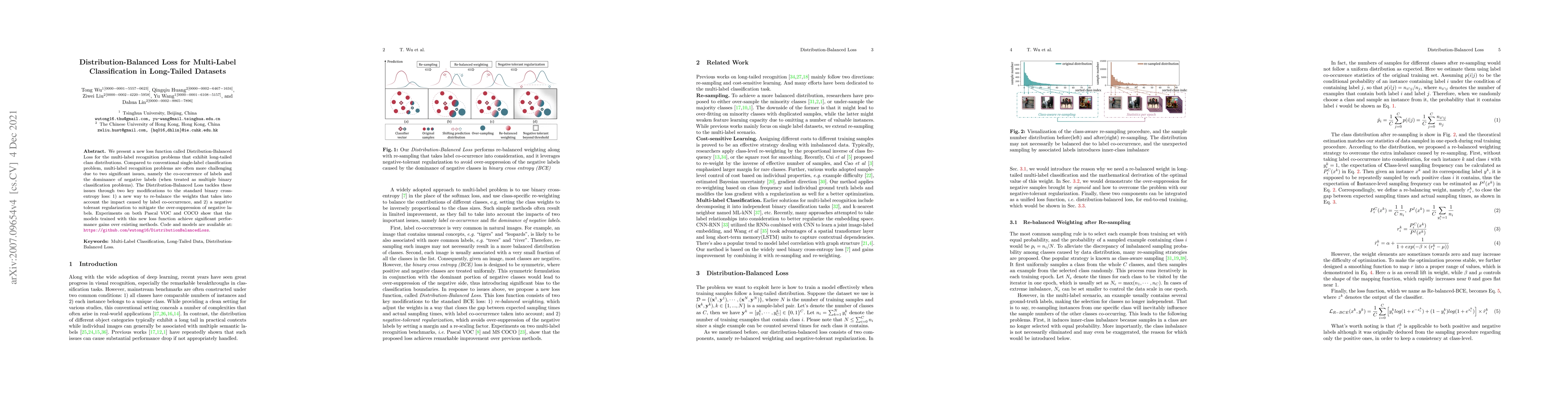 This paper introduces a Distribution-Balanced Loss for multi-label classification in long-tailed datasets, addressing the challenges of label co-occurrence and negative label dominance. The new loss function improves performance by rebalancing weights and incorporating negative tolerant regularization, demonstrating significant gains over existing methods on Pascal VOC and COCO datasets.