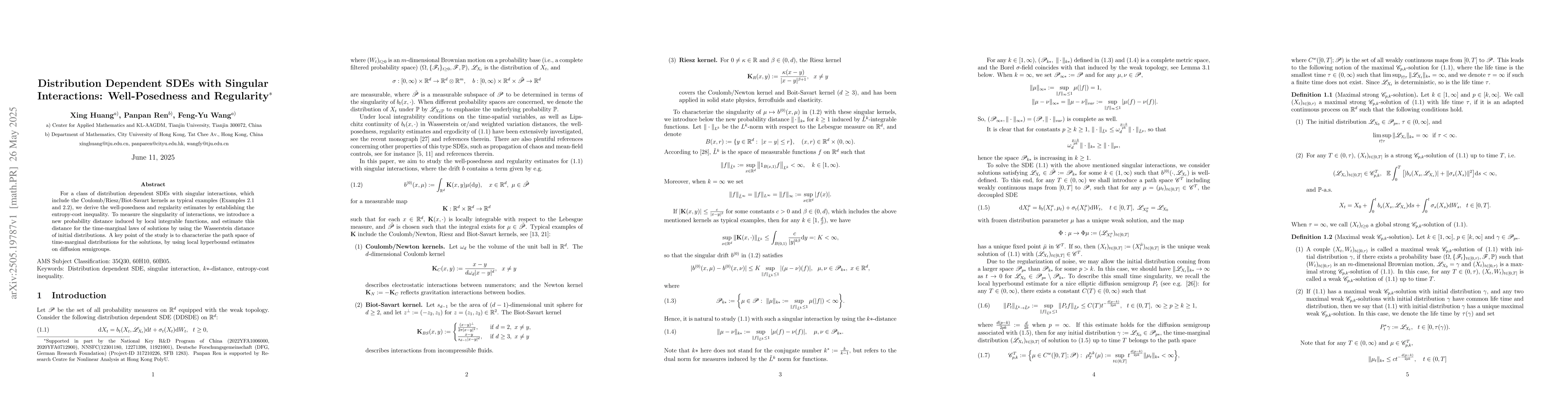 The research derives well-posedness and regularity estimates for distribution dependent SDEs with singular interactions, employing an entropy-cost inequality. It introduces a new probability distance to measure singularity and estimates it using Wasserstein distance of initial distributions. Local hyperbound estimates on diffusion semigroups are utilized to characterize the path space of time-marginal distributions.