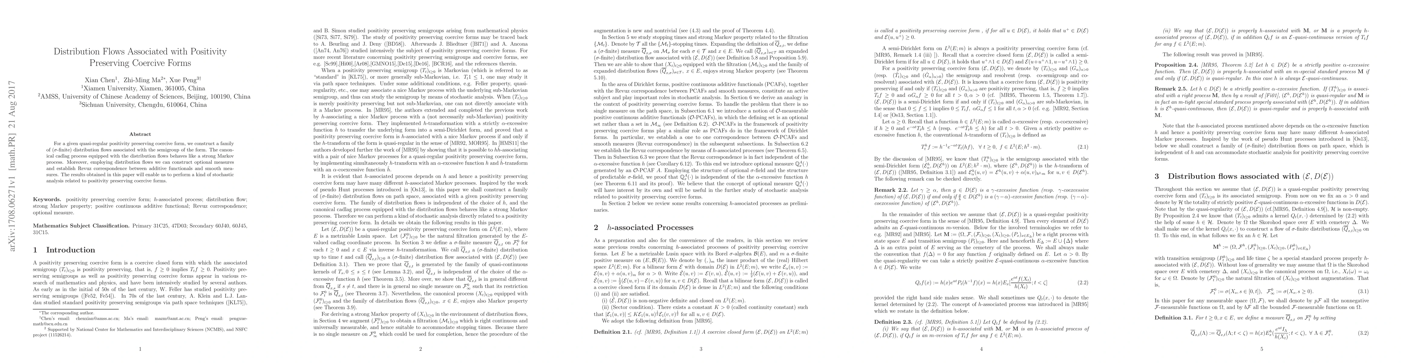 This paper constructs distribution flows associated with quasi-regular, positivity preserving coercive forms, establishing their behavior as a strong Markov process and enabling the construction of optional measures and the establishment of Revuz correspondence. These results facilitate stochastic analysis for such forms.