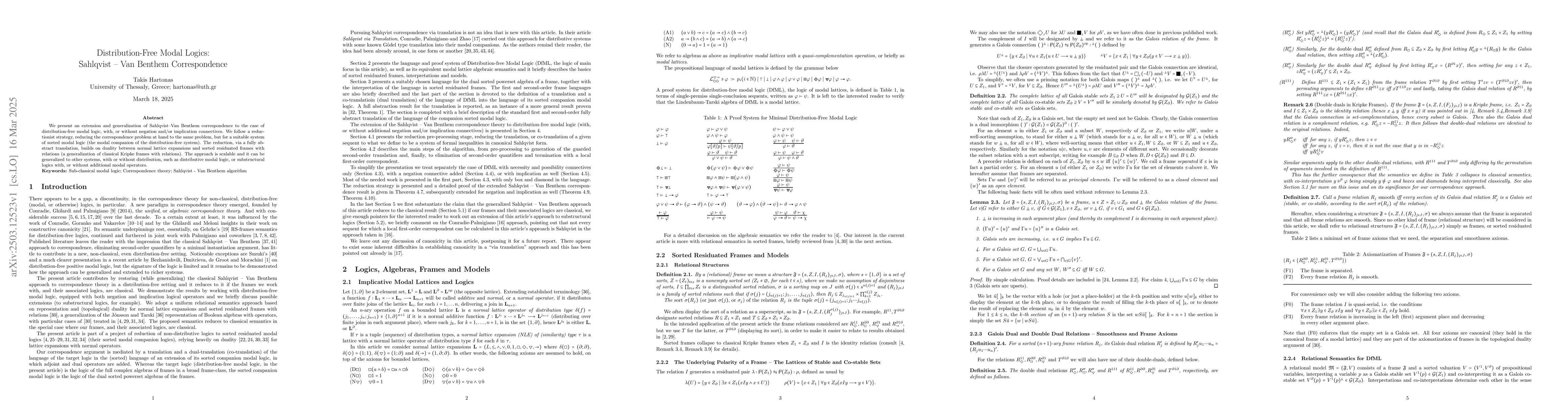 The paper presents an extension and generalization of the Sahlqvist-Van Benthem correspondence to distribution-free modal logic, using a reductionist strategy and duality between normal lattice expansions and sorted residuated frames with relations.
