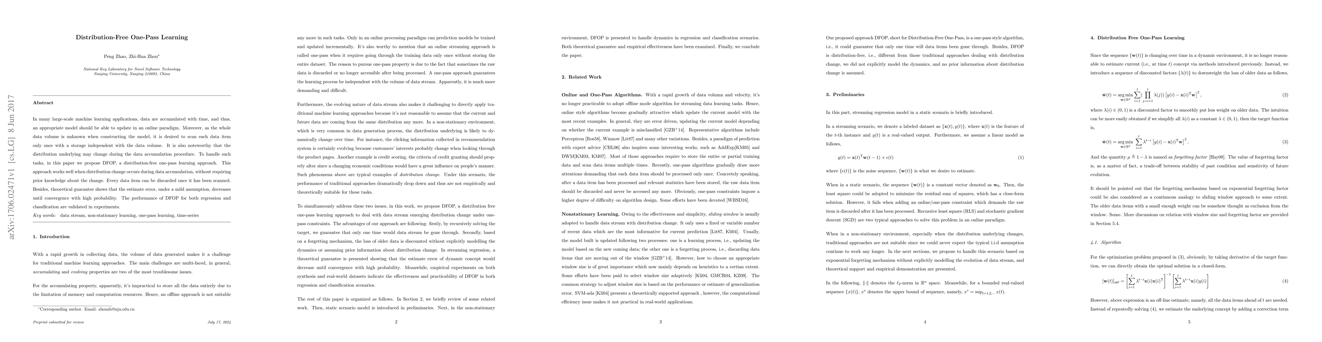 The research introduces DFOP, a distribution-free one-pass learning approach that updates models online as data accumulates, without needing prior knowledge of distribution changes. It scans each data item once, discards it post-processing, and provides a theoretical guarantee of decreasing estimate error. Experiments validate its performance in regression and classification tasks.