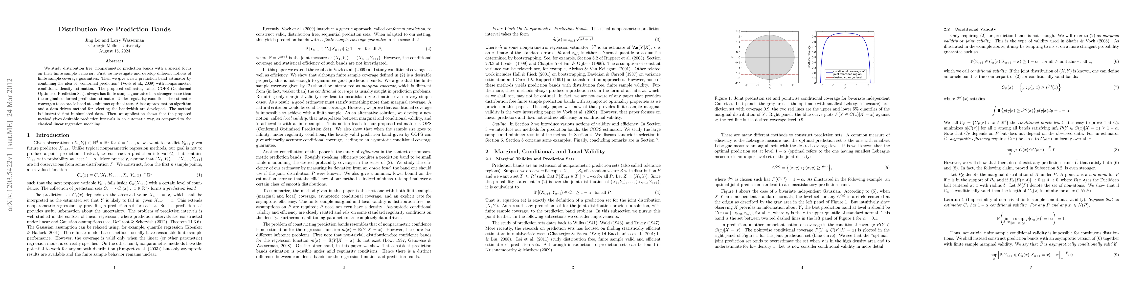 This paper develops a new distribution-free, nonparametric prediction band estimator called COPS, which combines conformal prediction with nonparametric density estimation to provide stronger finite sample coverage guarantees. The method is shown to converge to an optimal oracle band under regularity conditions.