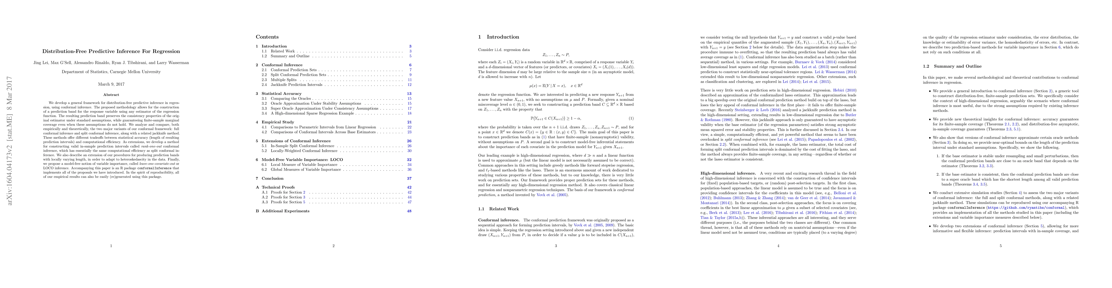 This paper introduces a distribution-free framework for predictive inference in regression using conformal inference, offering robust prediction bands that maintain consistency and finite-sample coverage even without standard assumptions. It compares full, split conformal, and jackknife methods, and provides extensions for in-sample intervals and heteroskedasticity-adaptive bands, along with a model-free variable importance measure.