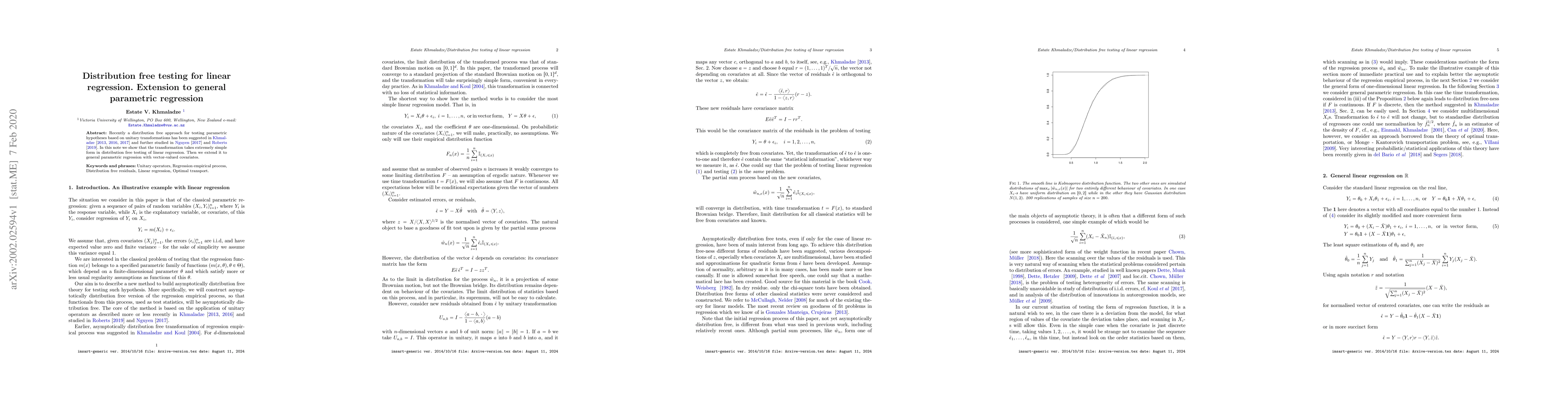This paper explores a distribution-free testing method for linear regression based on unitary transformations, demonstrating its simplicity and extending the approach to general parametric regression with vector-valued covariates.