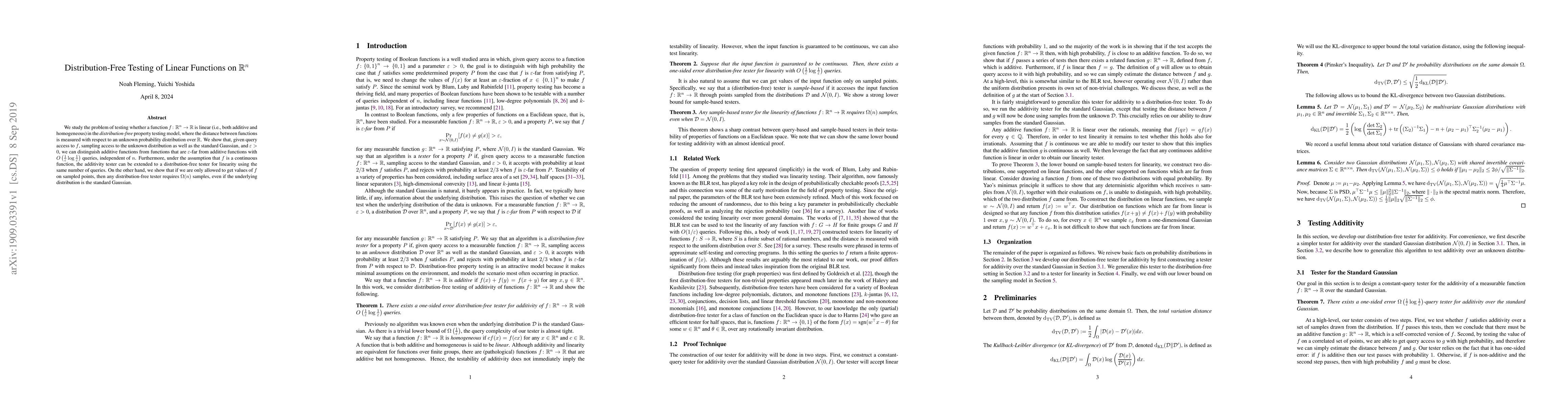 We study the problem of testing whether a function f:R^n->R is linear (i.e., both additive and homogeneous) in the distribution-free property testing model, where the distance between functions is measured with respect to an unknown probability distribution over R. We show that, given query access to f, sampling access to the unknown distribution as well as the standard Gaussian, and eps>0, we can distinguish additive functions from functions that are eps-far from additive functions with O((1/eps)log(1/eps)) queries, independent of n. Furthermore, under the assumption that f is a continuous function, the additivity tester can be extended to a distribution-free tester for linearity using the same number of queries. On the other hand, we show that if we are only allowed to get values of f on sampled points, then any distribution-free tester requires Omega(n) samples, even if the underlying distribution is the standard Gaussian.