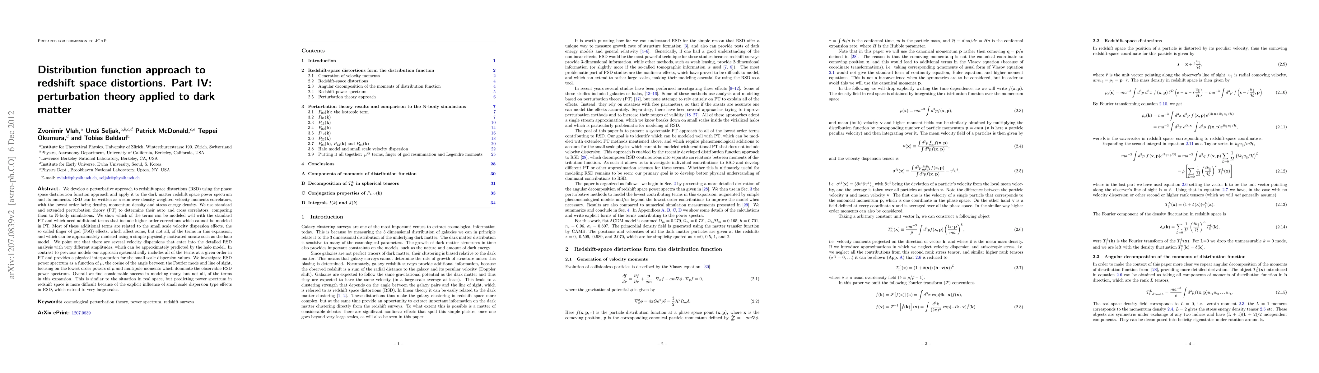 This paper develops a perturbative approach to redshift space distortions (RSD) using the phase space distribution function, applying it to dark matter's redshift space power spectrum. It systematically includes all terms at a given order in perturbation theory, modeling the effects of small scale velocity dispersions, known as "finger of god" effects, and provides a physical interpretation for these dispersions.