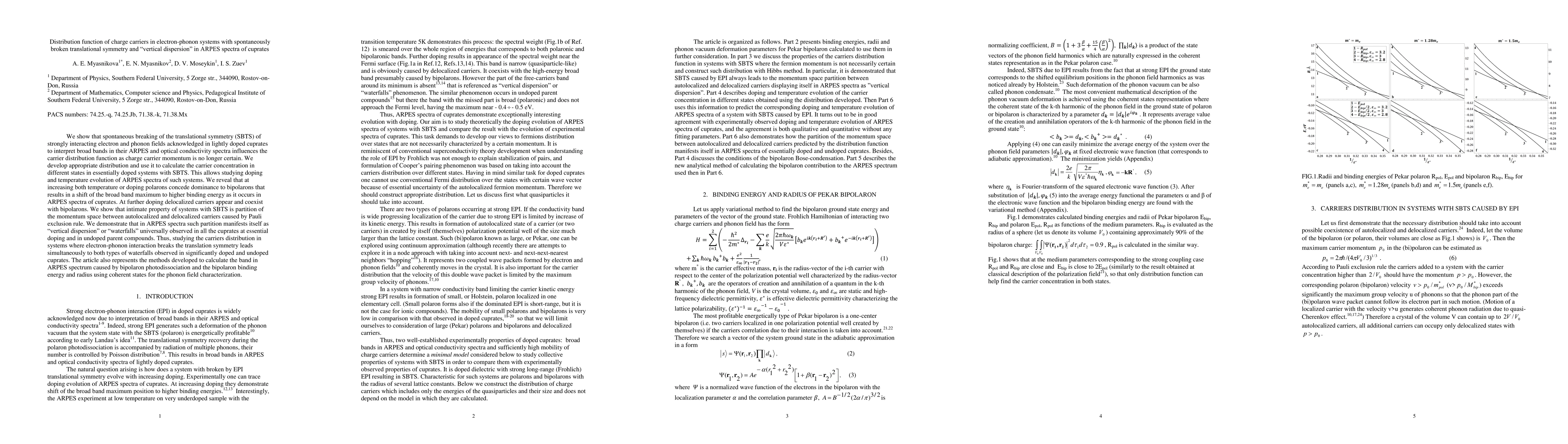 We show that spontaneous breaking of the translational symmetry (SBTS) of strongly interacting electron and phonon fields acknowledged in lightly doped cuprates to interpret broad bands in their ARPES and optical conductivity spectra influences the carrier distribution function as charge carrier momentum is no longer certain. We develop appropriate distribution and use it to calculate the carrier concentration in different states in essentially doped systems with SBTS. This allows studying doping and temperature evolution of ARPES spectra of such systems. We reveal that at increasing both temperature or doping polarons concede dominance to bipolarons that results in a shift of the broad band maximum to higher binding energy as it occurs in ARPES spectra of cuprates. At further doping delocalized carriers appear and coexist with bipolarons. We show that intimate property of systems with SBTS is partition of the momentum space between autolocalized and delocalized carriers caused by Pauli exclusion rule. We demonstrate that in ARPES spectra such partition manifests itself as `vertical dispersion` or waterfalls universally observed in all the cuprates at essential doping and in undoped parent compounds. Thus, studying the carriers distribution in systems where electron-phonon interaction breaks the translation symmetry leads simultaneously to both types of waterfalls observed in significantly doped and undoped cuprates. The article also represents the methods developed to calculate the band in ARPES spectrum caused by bipolaron photodissociation and the bipolaron binding energy and radius using coherent states for the phonon field characterization.