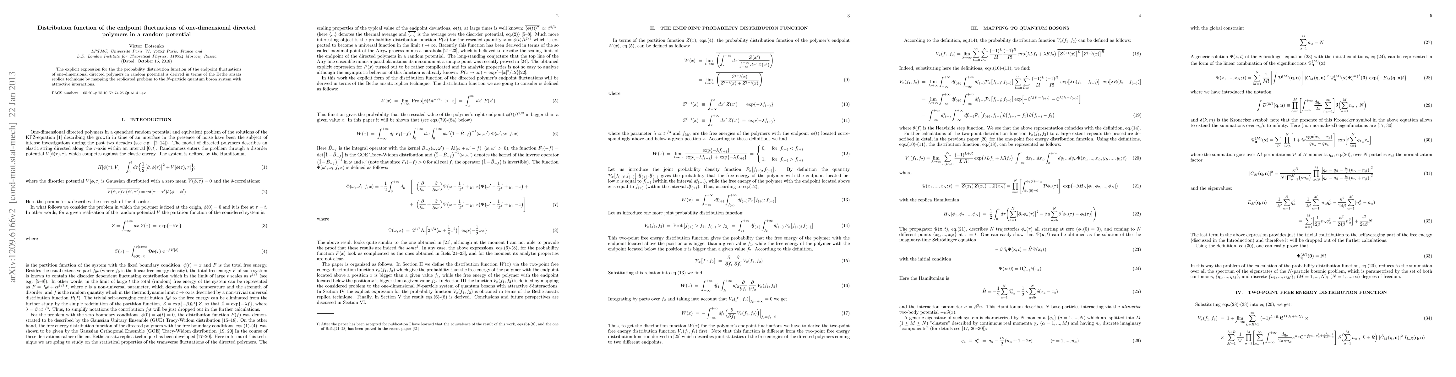 Summary: This paper derives the explicit probability distribution function for endpoint fluctuations of one-dimensional directed polymers using the Bethe ansatz replica technique, mapping the replicated problem to an N-particle quantum boson system with attractive interactions.