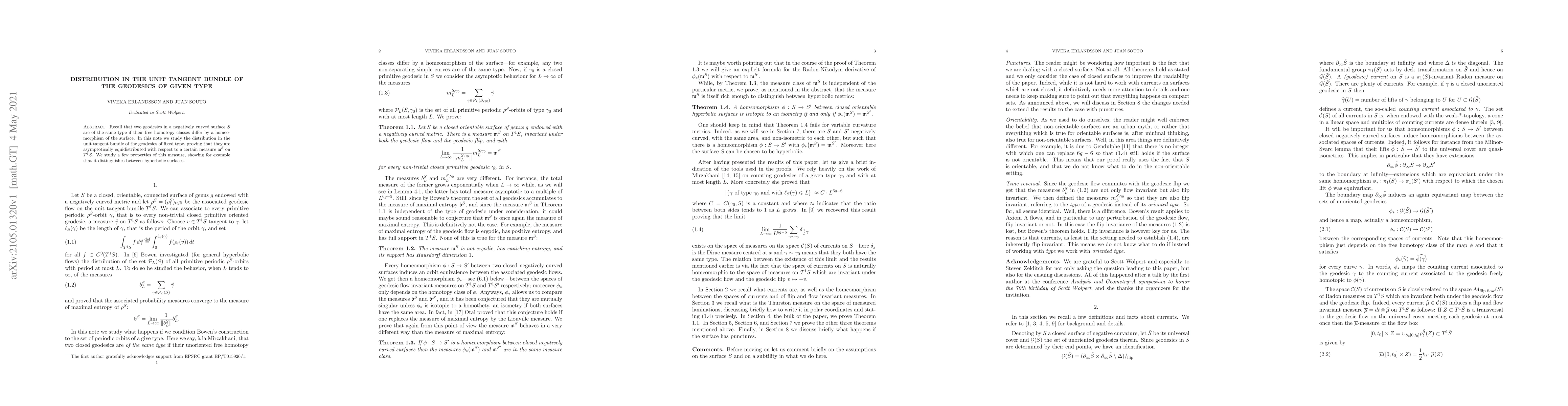 This paper investigates the distribution of geodesics of the same type in the unit tangent bundle of a negatively curved surface, proving their asymptotic equidistribution with respect to a specific measure $\mathfrak{m}^S$. It also explores properties of this measure, demonstrating its ability to differentiate between hyperbolic surfaces.