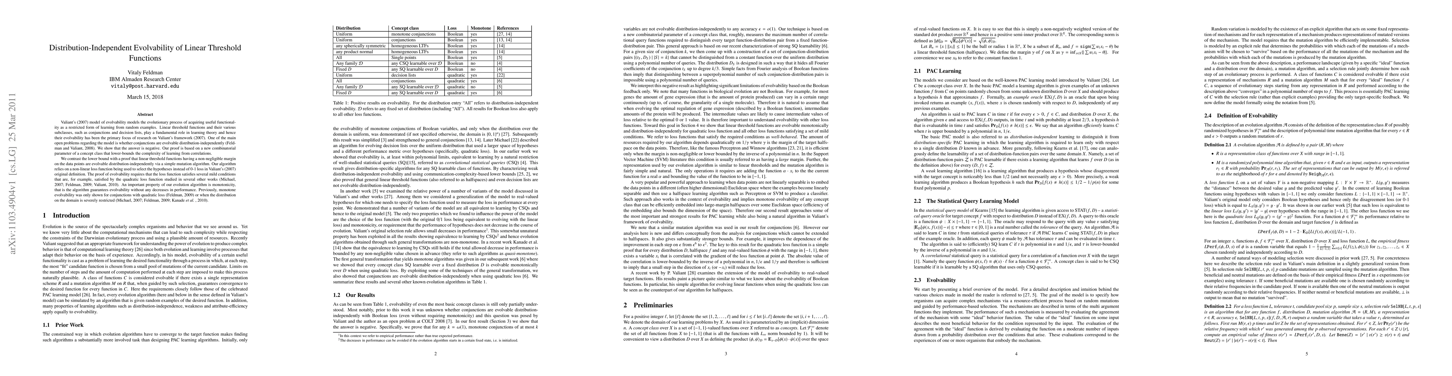 Valiant's (2007) model of evolvability models the evolutionary process of acquiring useful functionality as a restricted form of learning from random examples. Linear threshold functions and their various subclasses, such as conjunctions and decision lists, play a fundamental role in learning theory and hence their evolvability has been the primary focus of research on Valiant's framework (2007). One of the main open problems regarding the model is whether conjunctions are evolvable distribution-independently (Feldman and Valiant, 2008). We show that the answer is negative. Our proof is based on a new combinatorial parameter of a concept class that lower-bounds the complexity of learning from correlations. We contrast the lower bound with a proof that linear threshold functions having a non-negligible margin on the data points are evolvable distribution-independently via a simple mutation algorithm. Our algorithm relies on a non-linear loss function being used to select the hypotheses instead of 0-1 loss in Valiant's (2007) original definition. The proof of evolvability requires that the loss function satisfies several mild conditions that are, for example, satisfied by the quadratic loss function studied in several other works (Michael, 2007; Feldman, 2009; Valiant, 2010). An important property of our evolution algorithm is monotonicity, that is the algorithm guarantees evolvability without any decreases in performance. Previously, monotone evolvability was only shown for conjunctions with quadratic loss (Feldman, 2009) or when the distribution on the domain is severely restricted (Michael, 2007; Feldman, 2009; Kanade et al., 2010)