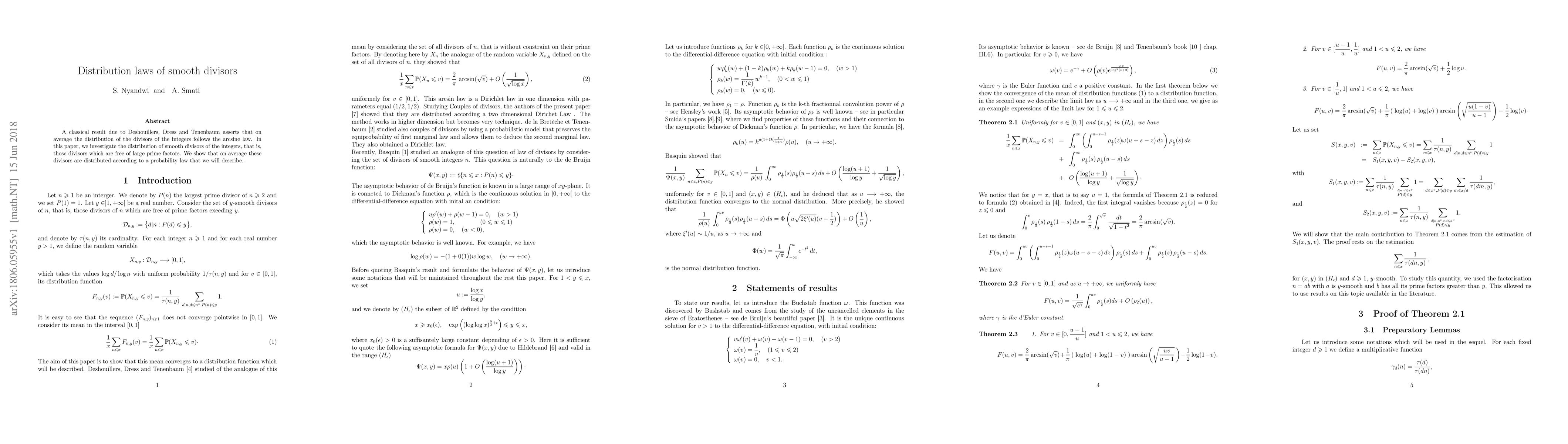 A classical result due to Deshouillers, Dress and Tenenbaum asserts that on average the distribution of the divisors of the integers follows the arcsine law. In this paper, we investigate the distribution of smooth divisors of the integers, that is, those divisors which are free of large prime factors. We show that on average these divisors are distributed according to a probability law that we will describe.