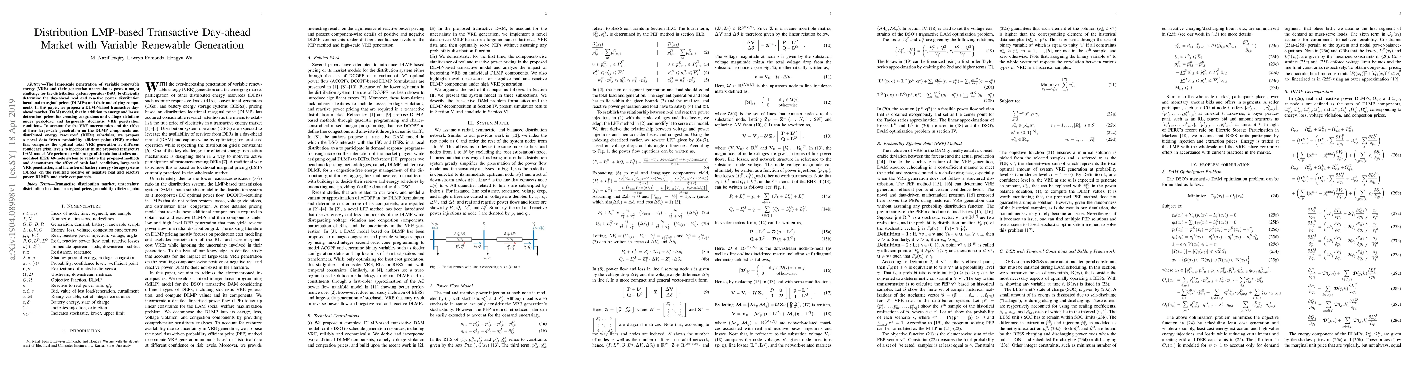 This paper proposes a DLMP-based transactive day-ahead market model to efficiently determine distribution locational marginal prices under variable renewable energy uncertainties. It introduces a novel data-driven PEP method to compute optimal VRE generation, validated through simulations on a modified IEEE 69-node system.