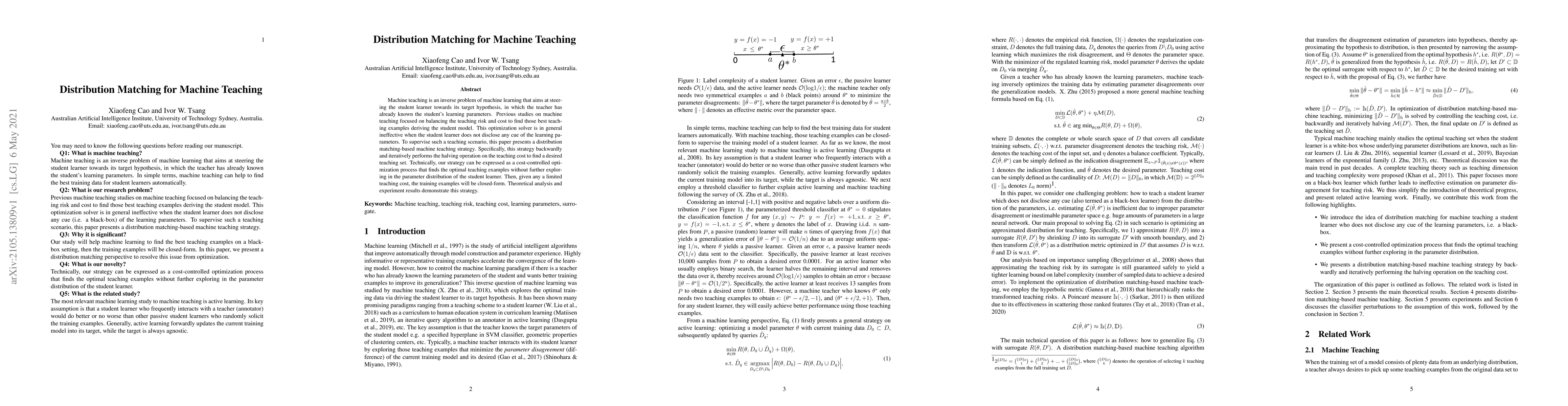 A new machine teaching strategy uses distribution matching to find optimal examples for teaching a student learner without requiring it to disclose its learning parameters. This approach can efficiently find the best teaching set within a limited cost.