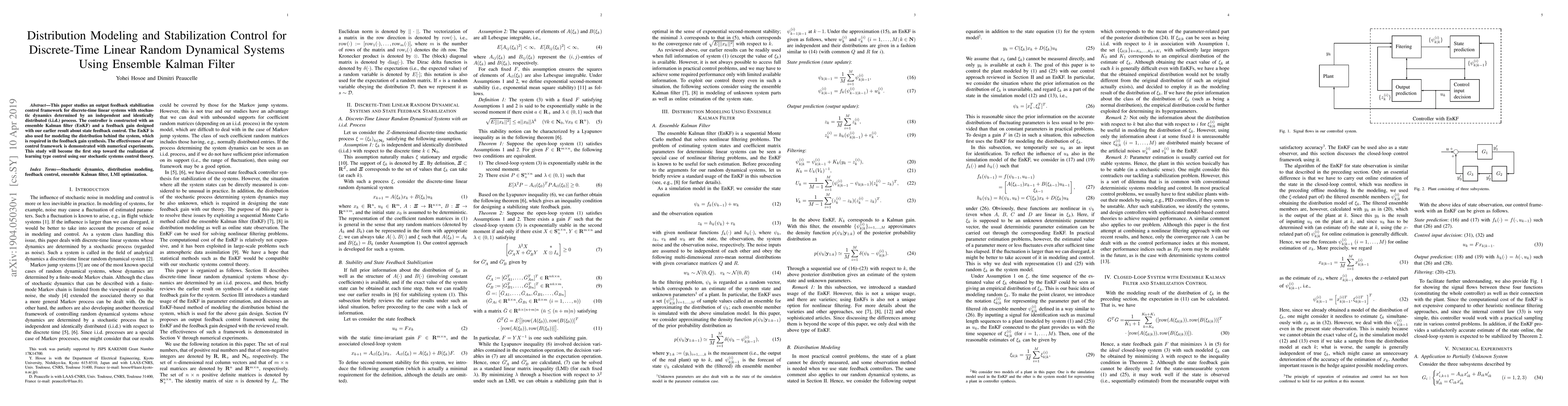 This paper proposes an output feedback stabilization control framework for discrete-time linear systems with stochastic dynamics, employing an ensemble Kalman filter for both control design and distribution modeling. Numerical experiments demonstrate the effectiveness of the proposed control framework.