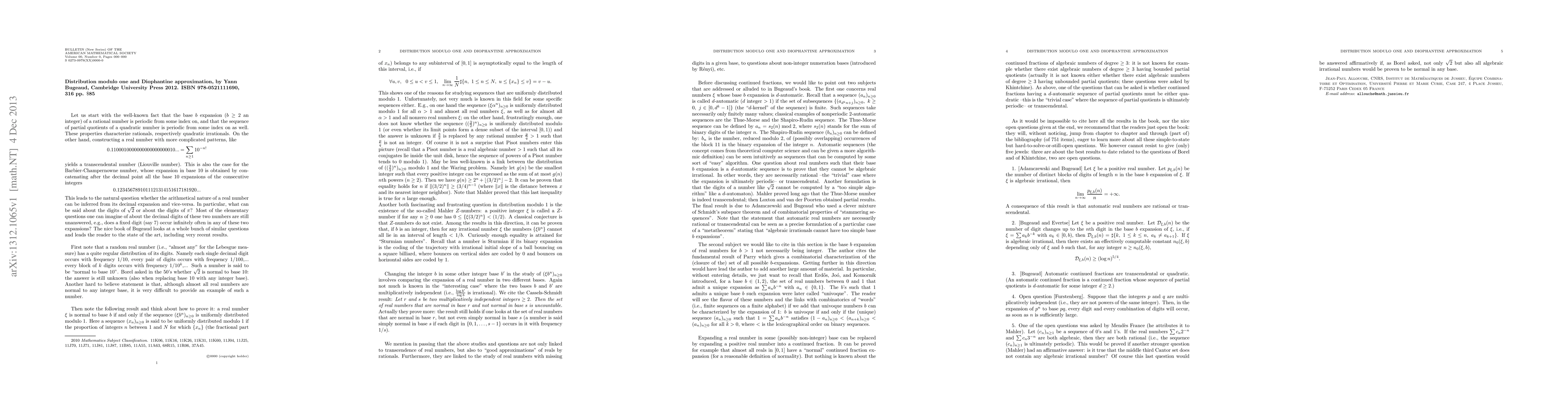 Review of the book: Distribution modulo one and Diophantine approximation, by Yann Bugeaud, Cambridge University Press 2012. ISBN 978-0521111690, 316 pp.