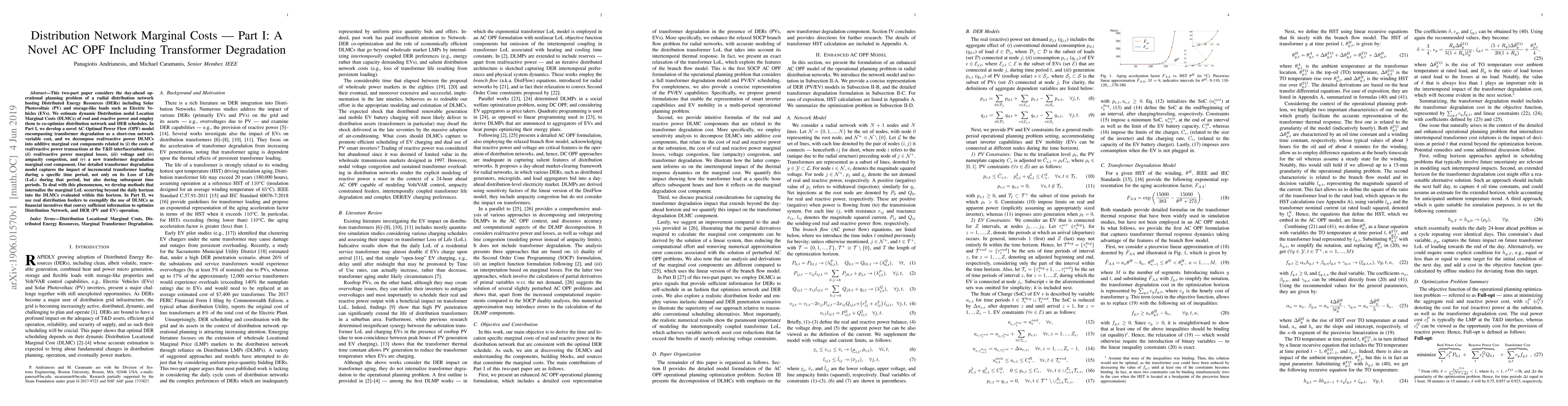 This two-part paper considers the day-ahead operational planning problem of a radial distribution network hosting Distributed Energy Resources (DERs) including Solar Photovoltaic (PV) and storage-like loads such as Electric Vehicles (EVs). We estimate dynamic Distribution nodal Location Marginal Costs (DLMCs) of real and reactive power and employ them to co-optimize distribution network and DER schedules. In Part I, we develop a novel AC Optimal Power Flow (OPF) model encompassing transformer degradation as a short-run network variable cost, and we decompose real/reactive power DLMCs into additive marginal cost components related to (i) the costs of real/reactive power transactions at the T&D interface/substation, (ii) real/reactive power marginal losses, (iii) voltage and (iv) ampacity congestion, and (v) a new transformer degradation marginal cost component. Our detailed transformer degradation model captures the impact of incremental transformer loading during a specific time period, not only on its Loss of Life (LoL) during that period, but also during subsequent time periods. To deal with this phenomenon, we develop methods that internalize the marginal LoL occurring beyond the daily horizon into the DLMCs evaluated within this horizon. In Part II, we use real distribution feeders to exemplify the use of DLMCs as financial incentives that convey sufficient information to optimize Distribution Network, and DER (PV and EV) operation.