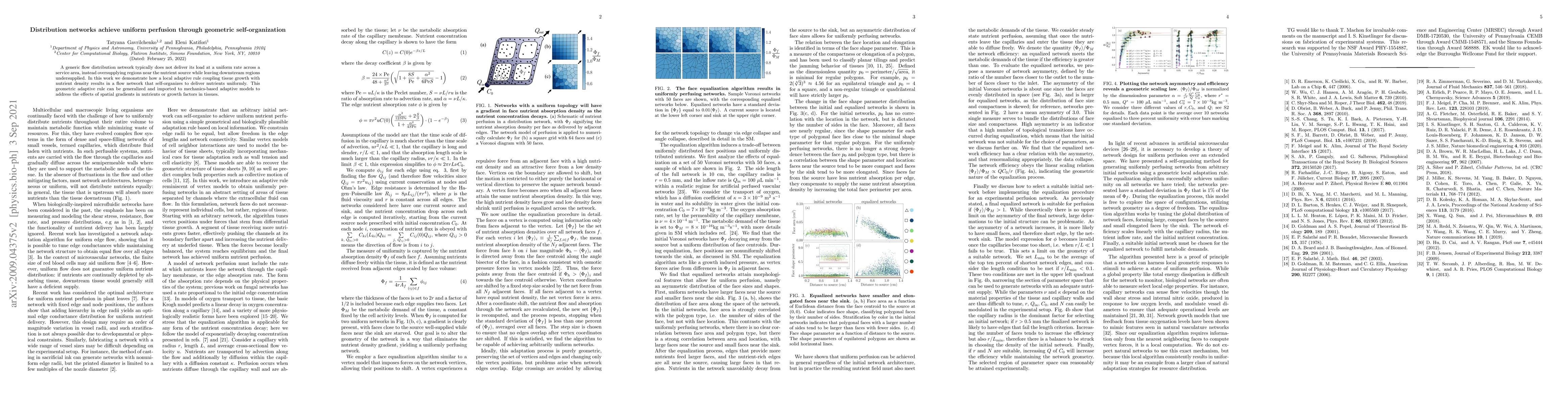 A generic flow distribution network typically does not deliver its load at a uniform rate across a service area, instead oversupplying regions near the nutrient source while leaving downstream regions undersupplied. In this work we demonstrate how a local adaptive rule coupling tissue growth with nutrient density results in a flow network that self-organizes to deliver nutrients uniformly. This geometric adaptive rule can be generalized and imported to mechanics-based adaptive models to address the effects spatial gradients in nutrients or growth factors in tissues.