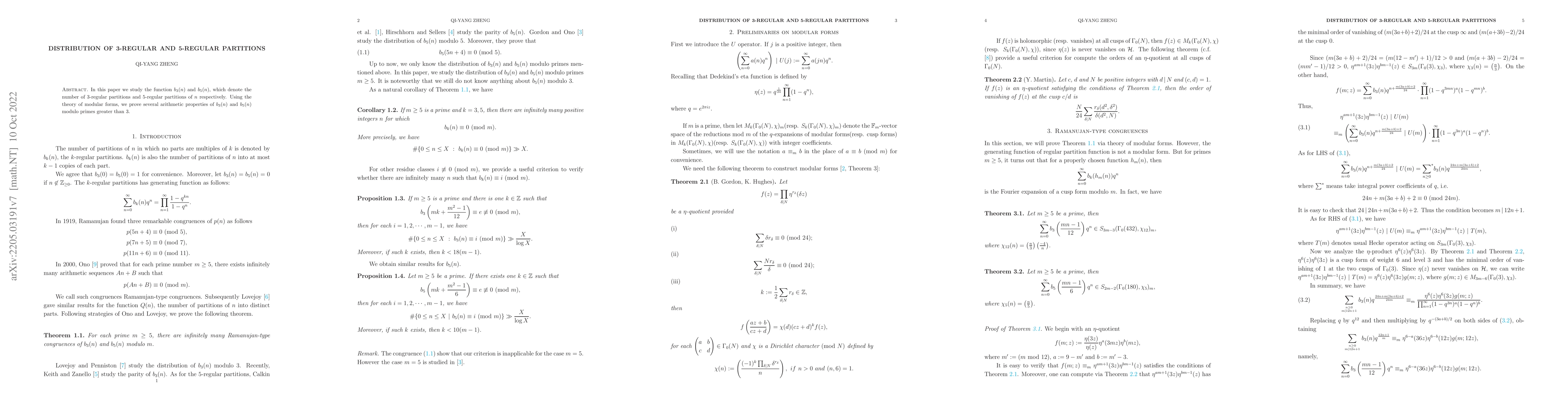This paper investigates the number of $3$-regular and $5$-regular partitions of $n$, denoted by $b_3(n)$ and $b_5(n)$, respectively, and proves several arithmetic properties of these functions using modular forms, particularly modulo primes greater than $3$.