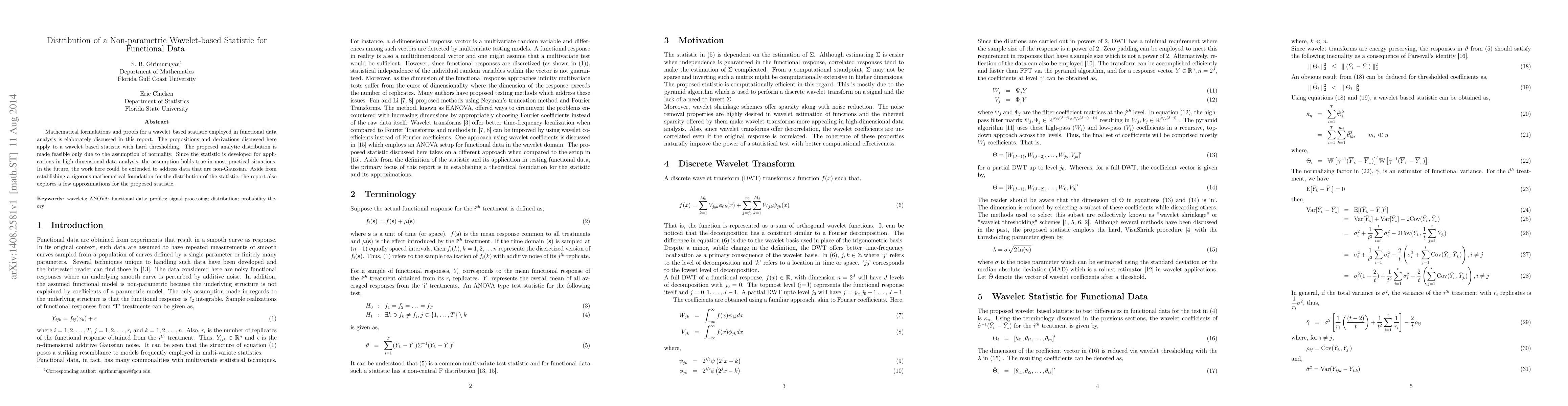 Mathematical formulations and proofs for a wavelet based statistic employed in functional data analysis is elaborately discussed in this report. The propositions and derivations discussed here apply to a wavelet based statistic with hard thresholding. The proposed analytic distribution is made feasible only due to the assumption of normality. Since the statistic is developed for applications in high dimensional data analysis, the assumption holds true in most practical situations. In the future, the work here could be extended to address data that are non-Gaussian. Aside from establishing a rigorous mathematical foundation for the distribution of the statistic, the report also explores a few approximations for the proposed statistic.