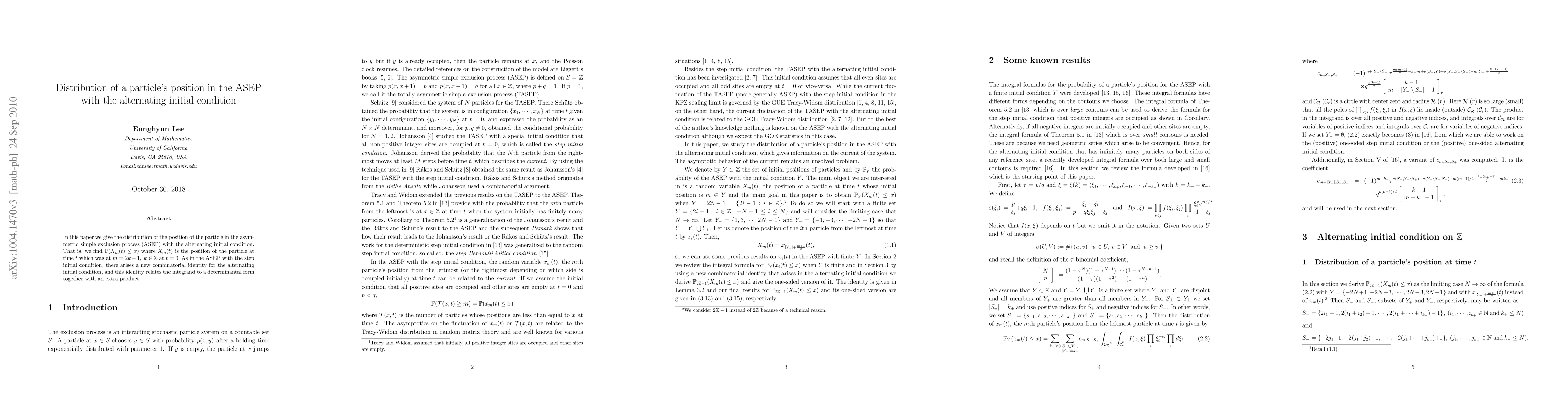 This paper determines the distribution of a particle's position in the ASEP with an alternating initial condition, deriving a new combinatorial identity that connects the probability to a determinantal form with an additional product term.