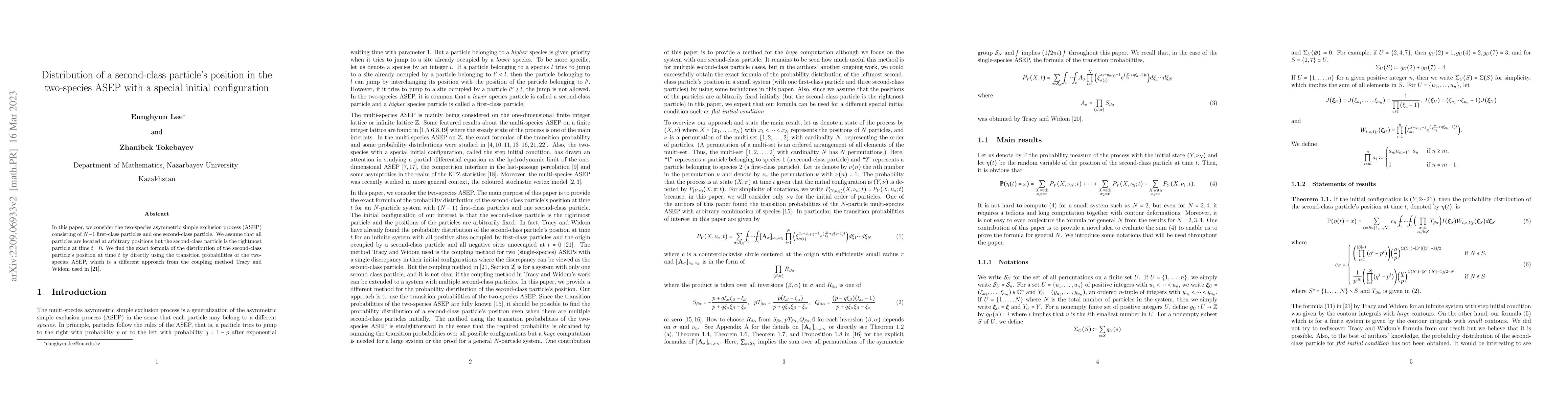 This paper studies the two-species asymmetric simple exclusion process (ASEP) with $N-1$ first-class and one second-class particle, initially positioned rightmost. It proposes an alternative method to determine the probability distribution of the second-class particle's position, differing from Tracy and Widom's approach.