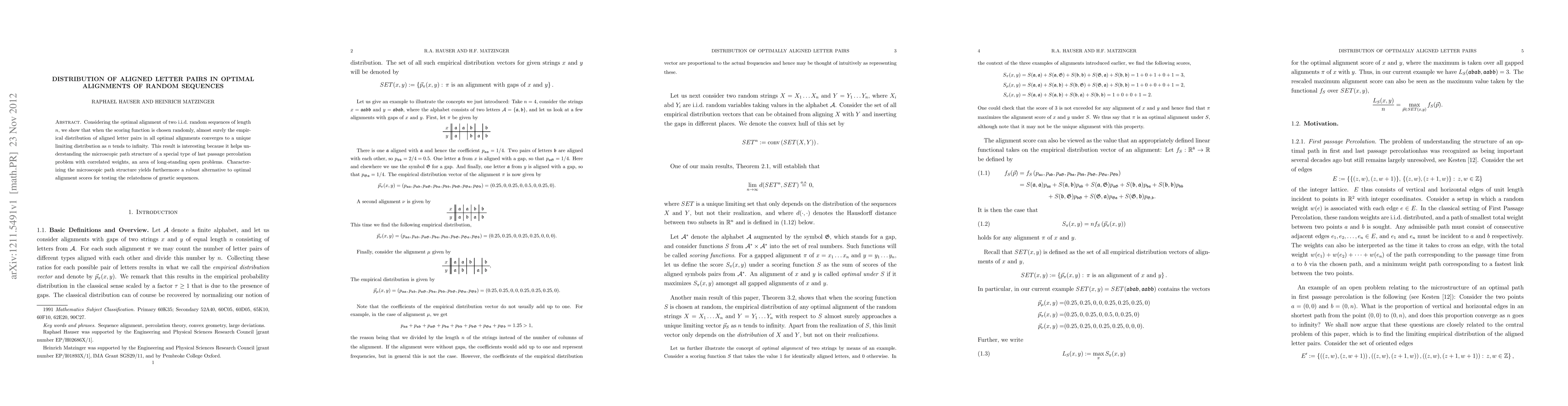 The paper shows that for random sequences of length n, almost surely the distribution of aligned letter pairs in optimal alignments converges to a unique limiting distribution as n tends to infinity. This has implications for understanding genetic sequence similarity.