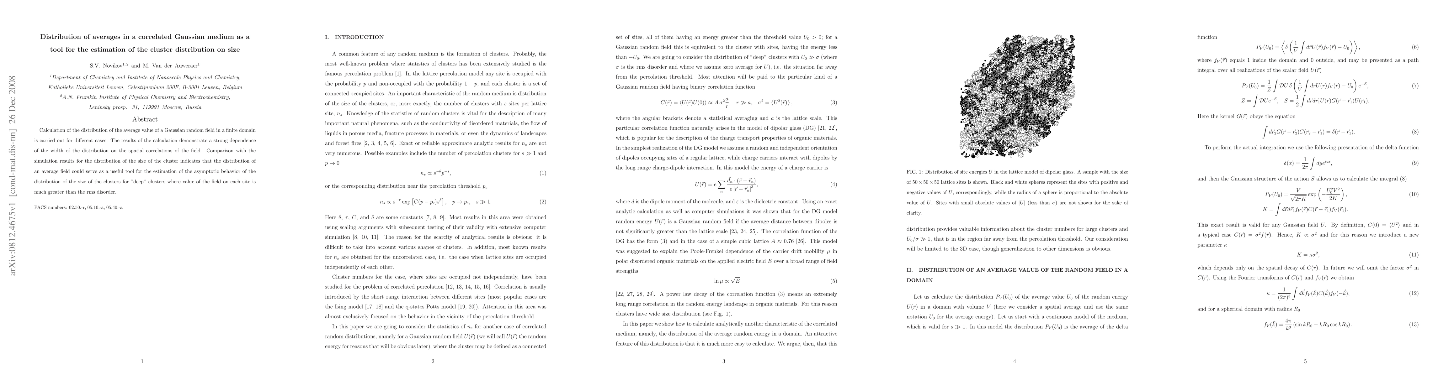 Calculation of the distribution of the average value of a Gaussian random field in a finite domain is carried out for different cases. The results of the calculation demonstrate a strong dependence of the width of the distribution on the spatial correlations of the field. Comparison with the simulation results for the distribution of the size of the cluster indicates that the distribution of an average field could serve as a useful tool for the estimation of the asymptotic behavior of the distribution of the size of the clusters for "deep" clusters where value of the field on each site is much greater than the rms disorder.