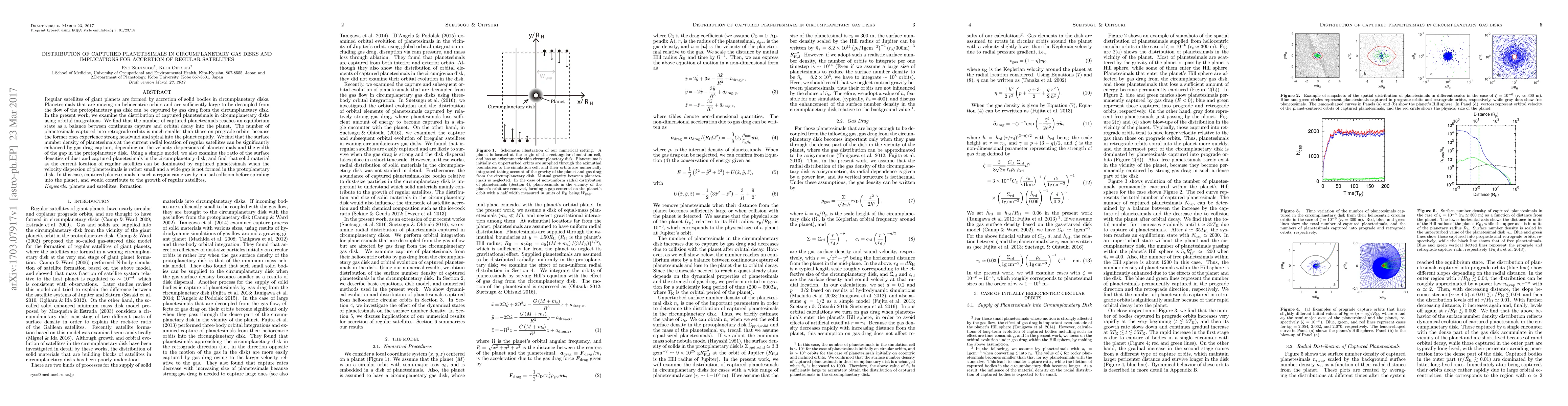 This research investigates the distribution of captured planetesimals in circumplanetary gas disks and their role in the formation of regular satellites. It finds that captured planetesimals reach an equilibrium state due to continuous capture and orbital decay, with significantly more prograde than retrograde captures. The study concludes that gas drag can enhance the surface density of planetesimals at satellite locations, potentially contributing to satellite growth when velocity dispersions are low and gaps in the protoplanetary disk are absent.