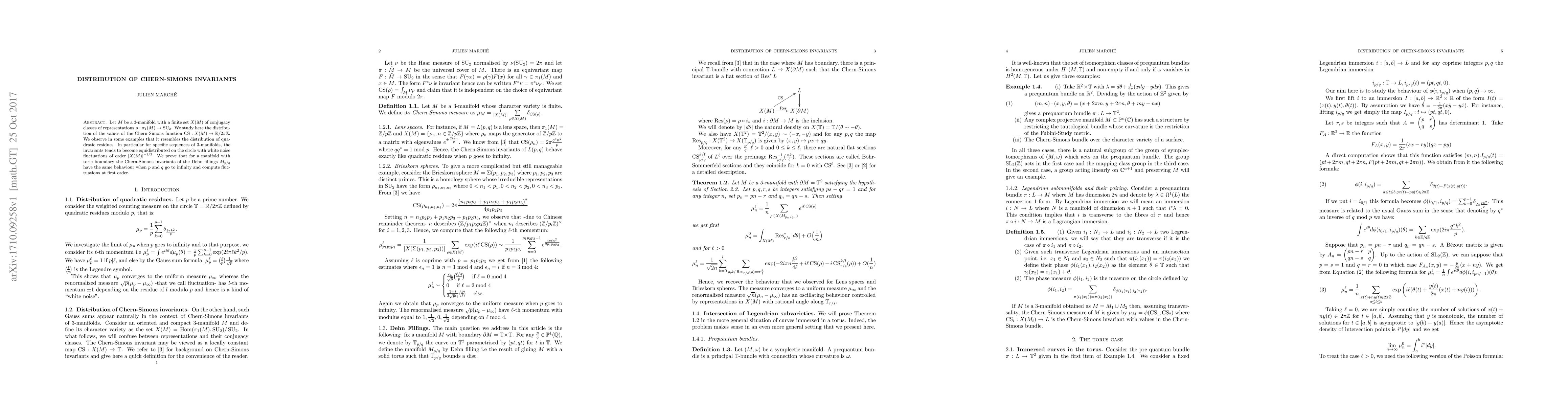 This paper studies the distribution of Chern-Simons invariants for 3-manifolds, showing they tend to equidistribute on the circle for specific sequences, with fluctuations scaling as $|X(M)|^{-1/2}$. It specifically proves the same behavior for toric boundary manifolds under Dehn fillings as $p$ and $q$ approach infinity.