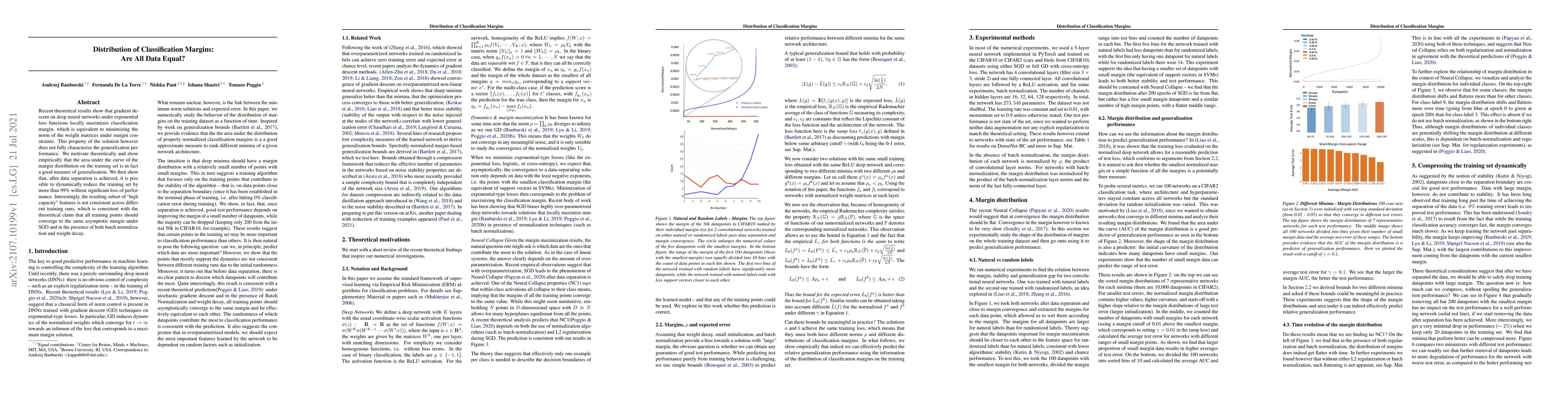 Recent theoretical results show that gradient descent on deep neural networks under exponential loss functions locally maximizes classification margin, which is equivalent to minimizing the norm of the weight matrices under margin constraints. This property of the solution however does not fully characterize the generalization performance. We motivate theoretically and show empirically that the area under the curve of the margin distribution on the training set is in fact a good measure of generalization. We then show that, after data separation is achieved, it is possible to dynamically reduce the training set by more than 99% without significant loss of performance. Interestingly, the resulting subset of "high capacity" features is not consistent across different training runs, which is consistent with the theoretical claim that all training points should converge to the same asymptotic margin under SGD and in the presence of both batch normalization and weight decay.