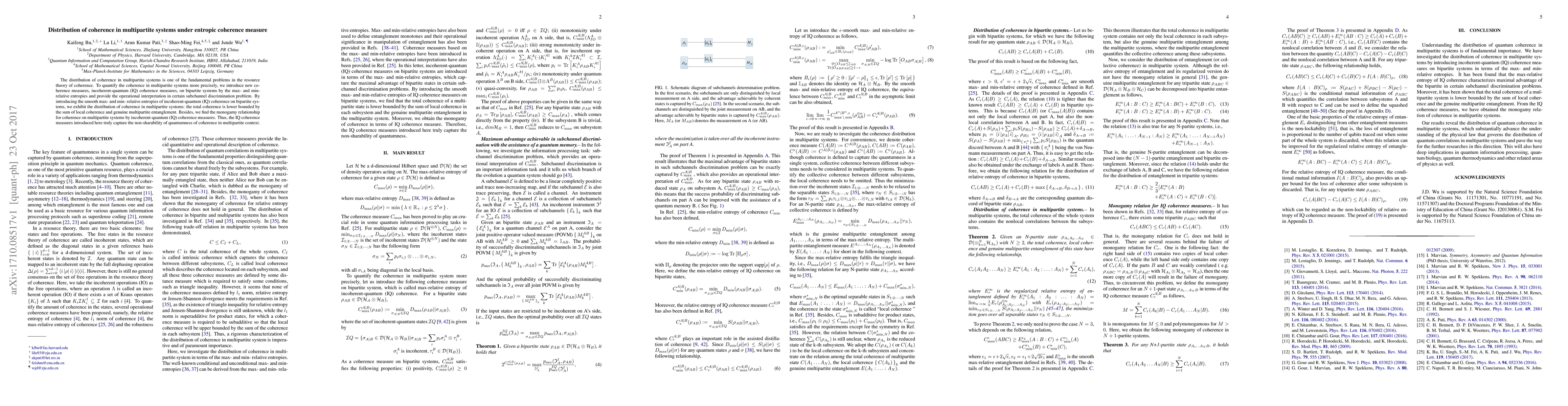 The distribution of coherence in multipartite systems is one of the fundamental problems in the resource theory of coherence. To quantify the coherence in multipartite systems more precisely, we introduce new coherence measures, incoherent-quantum (IQ) coherence measures, on bipartite systems by the max- and min- relative entropies and provide the operational interpretation in certain subchannel discrimination problem. By introducing the smooth max- and min- relative entropies of incoherent-quantum (IQ) coherence on bipartite systems, we exhibit the distribution of coherence in multipartite systems: the total coherence is lower bounded by the sum of local coherence and genuine multipartite entanglement. Besides, we find the monogamy relationship for coherence on multipartite systems by incoherent-quantum (IQ) coherence measures. Thus, the IQ coherence measures introduced here truly capture the non-sharability of quantumness of coherence in multipartite context.
