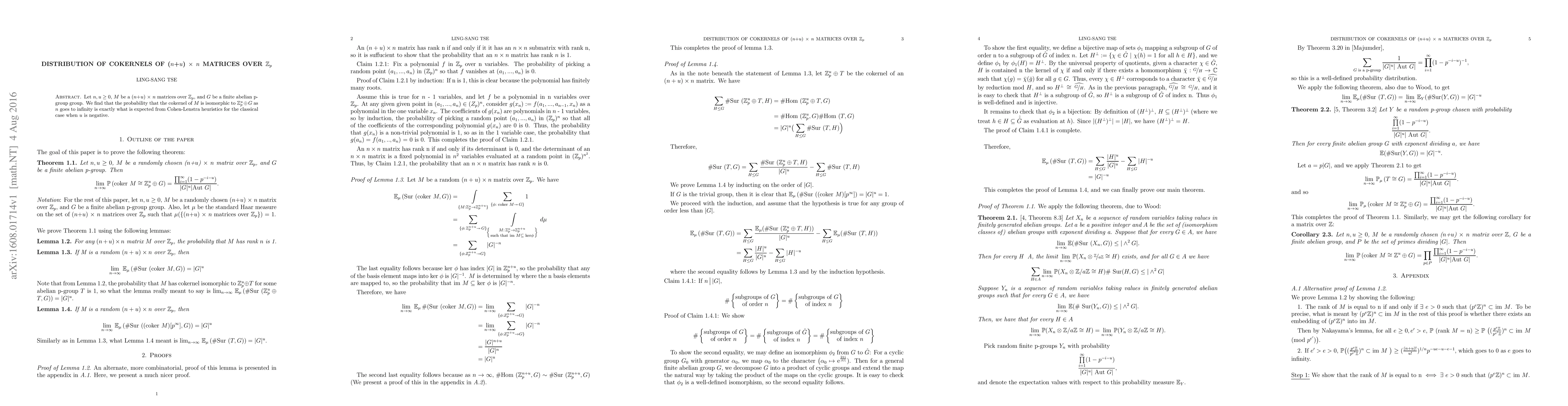 This paper investigates the distribution of cokernels of $(n+u) \times n$ matrices over $\mathbb{Z}_p$ and finds that as $n$ approaches infinity, the probability that the cokernel is isomorphic to $\mathbb{Z}_p^u \oplus G$ aligns with Cohen-Lenstra heuristics for classical cases.