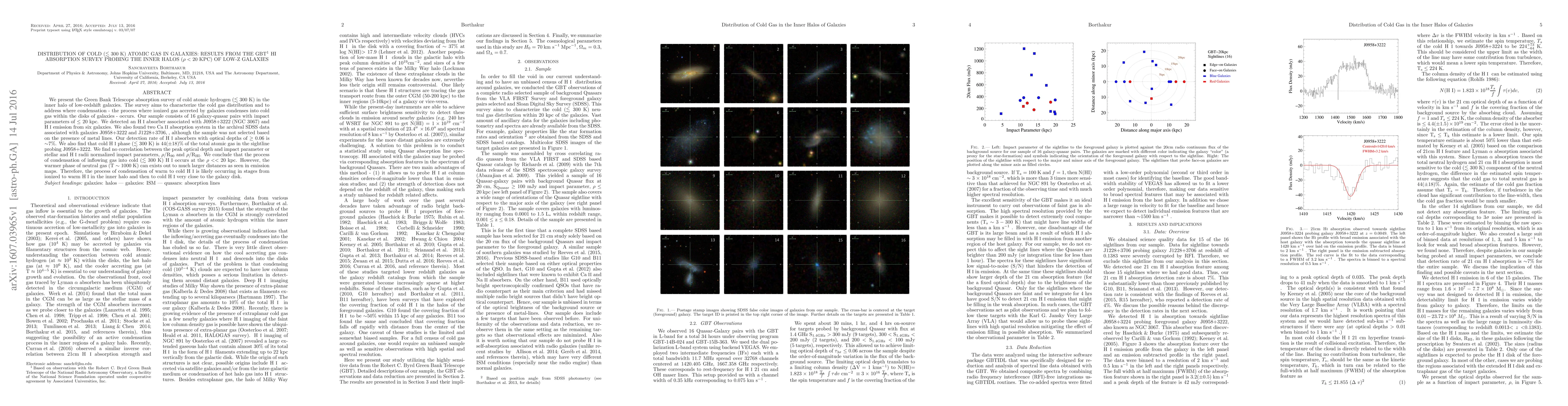 We present the Green Bank Telescope absorption survey of cold atomic hydrogen ($\lesssim 300$K) in the inner halo of low-redshift galaxies. The survey aims to characterize the cold gas distribution and to address where condensation - the process where ionized gas accreted by galaxies condenses into cold gas within the disks of galaxies - occurs. Our sample consists of 16 galaxy-quasar pairs with impact parameters of $\le$ 20kpc. We detected an HI absorber associated with J0958+3222 (NGC 3067) and HI emission from six galaxies. We also found two \ion{Ca}{2} absorption system in the archival SDSS data associated with galaxies J0958+3222 and J1228+3706, although the sample was not selected based on the presence of metals in absorption. Our detection rate of HI absorbers with optical depths of $\ge 0.06$ is $\sim$7\%. We also find that cold HI phase ($\lesssim$300K) is 44($\pm$18)\% of the total atomic gas in the sightline probing J0958+3222. We find no correlation between the peak optical depth and impact parameter or stellar and HI radii normalized impact parameters, $\rho/\rm R_{90}$ and $\rho/\rm R_{HI}$. We conclude that the process of condensation of inflowing gas into cold ($\lesssim$ 300K) HI occurs at the $\rho << 20$kpc. However, the warmer phase of neutral gas (T $\sim$ 1000K) can exists out to much larger distances as seen in emission maps. Therefore, the process of condensation of warm to cold HI is likely occurring in stages from ionized to warm HI in the inner halo and then to cold HI very close to the galaxy disk.