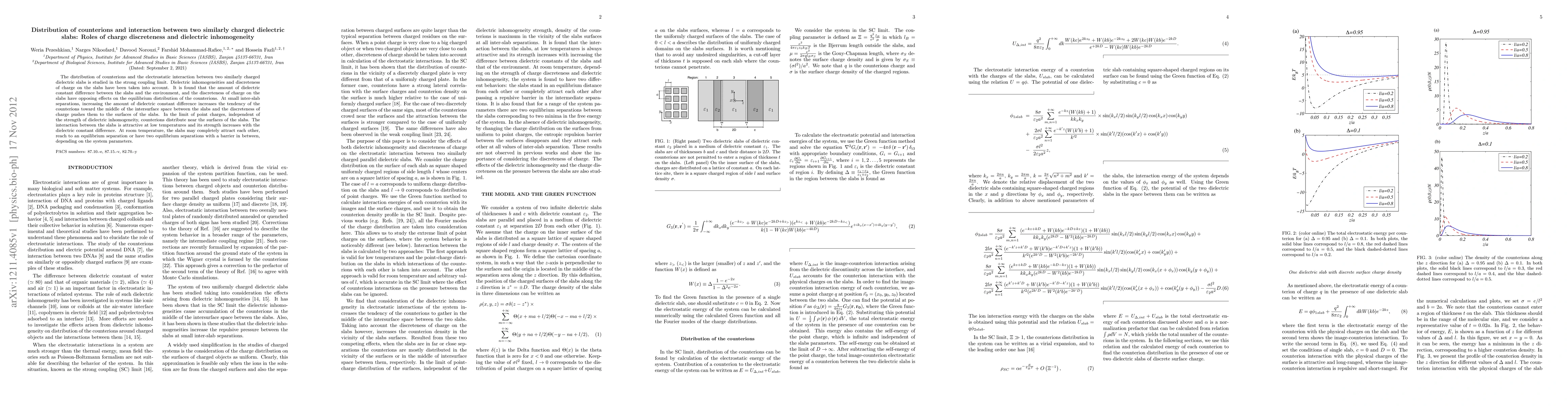 This paper investigates the counterion distribution and electrostatic interaction between similarly charged dielectric slabs, considering charge discreteness and dielectric inhomogeneity. It reveals that dielectric constant differences and charge discreteness influence counterion distribution and interaction strength, leading to varied behaviors depending on temperature and system parameters.