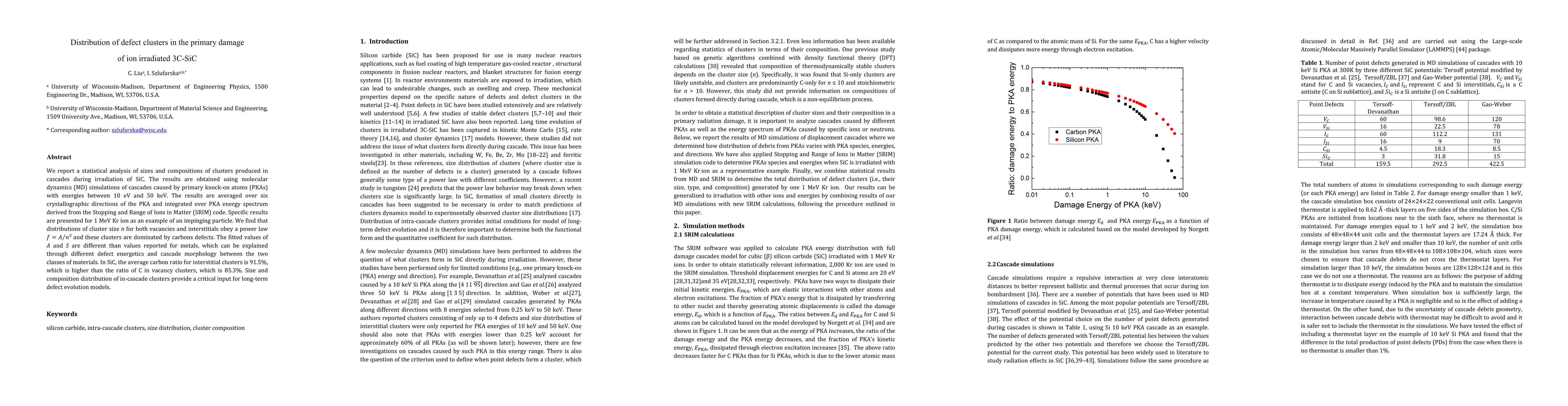 This study uses molecular dynamics simulations to analyze defect clusters formed in ion-irradiated 3C-SiC, finding that cluster sizes follow a power law and are predominantly carbon-based. The carbon ratio in interstitial clusters is notably higher than in vacancy clusters, highlighting differences in defect energetics compared to metals.