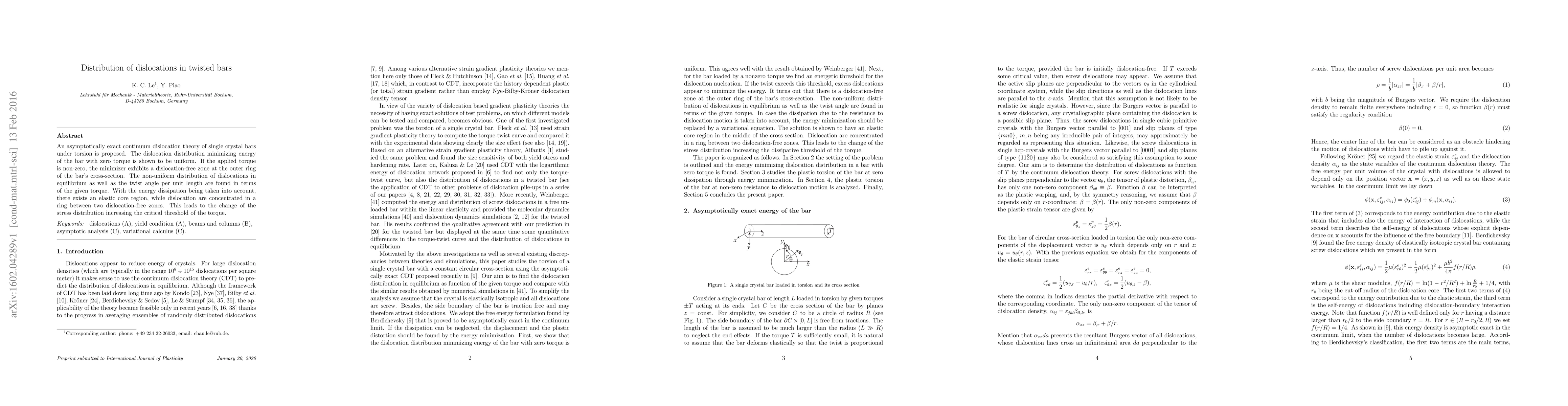 An asymptotically exact continuum dislocation theory of single crystal bars under torsion is proposed. The dislocation distribution minimizing energy of the bar with zero torque is shown to be uniform. If the applied torque is non-zero, the minimizer exhibits a dislocation-free zone at the outer ring of the bar's cross-section. The non-uniform distribution of dislocations in equilibrium as well as the twist angle per unit length are found in terms of the given torque. With the energy dissipation being taken into account, there exists an elastic core region, while dislocation are concentrated in a ring between two dislocation-free zones. This leads to the change of the stress distribution increasing the critical threshold of the torque.