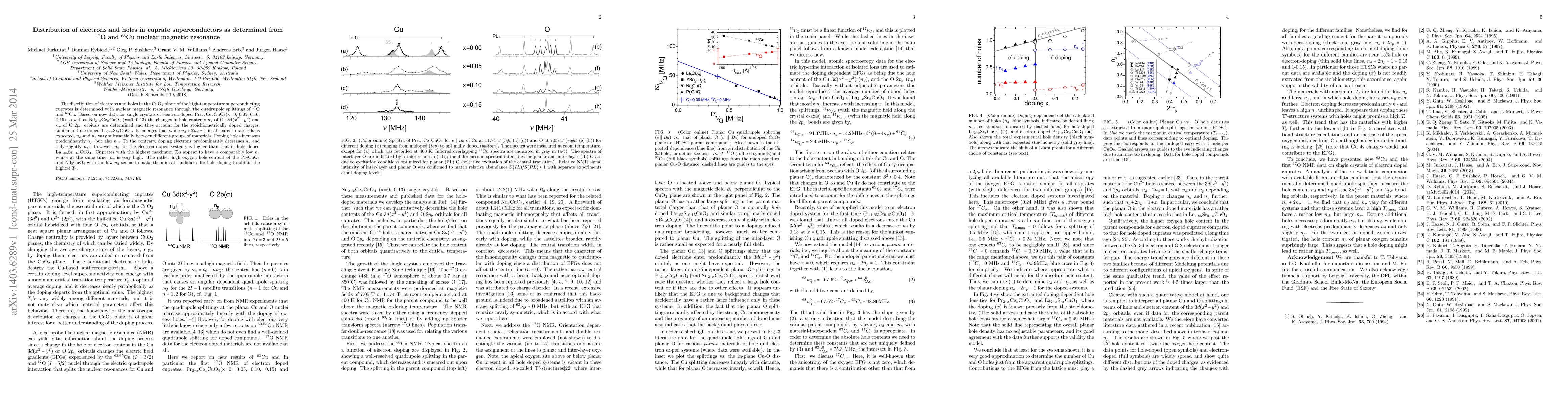 The distribution of electrons and holes in the CuO$_2$ plane of the high-temperature superconducting cuprates is determined with nuclear magnetic resonance through the quadrupole splittings of $^{17}$O and $^{63}$Cu. Based on new data for single crystals of electron-doped Pr$_{2-x}$Ce$_x$CuO$_4$(x=0, 0.05, 0.10, 0.15) as well as Nd$_{2-x}$Ce$_x$CuO$_4$ (x=0, 0.13) the changes in hole contents $n_d$ of Cu 3d$(x^2-y^2)$ and $n_p$ of O 2$p_\sigma$ orbitals are determined and they account for the stoichiometrically doped charges, similar to hole-doped \lsco. It emerges that while $n_d+2n_p=1$ in all parent materials as expected, $n_d$ and $n_p$ vary substantially between different groups of materials. Doping holes increases predominantly $n_p$, but also $n_d$. To the contrary, doping electrons predominantly decreases $n_d$ and only slightly $n_p$. However, $n_p$ for the electron doped systems is higher than that in hole doped La$_{1.85}$Sr$_{0.15}$CuO$_4$. Cuprates with the highest maximum $T_{\rm c}$s appear to have a comparably low $n_d$ while, at the same time, $n_p$ is very high. The rather high oxygen hole content of the Pr$_2$CuO$_4$ and Nd$_2$CuO$_4$ with the low $n_d$ seems to make them ideal candidates for hole doping to obtain the highest $T_{\rm c}$.