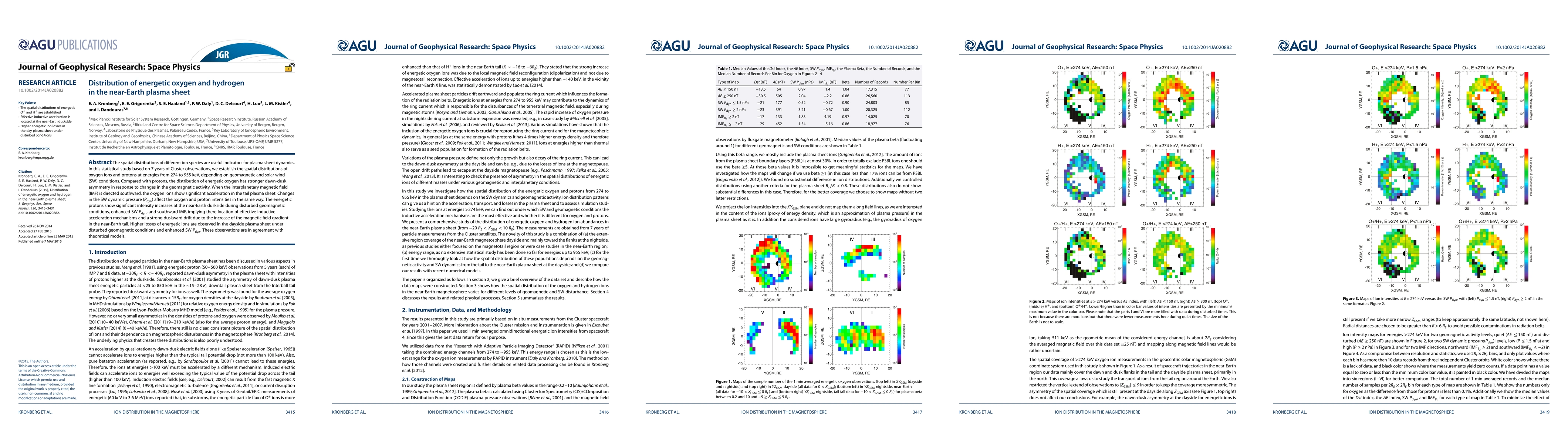 This study uses 7 years of Cluster observations to analyze the spatial distributions of energetic oxygen ions and protons in the near-Earth plasma sheet, revealing stronger dawn-dusk asymmetry in oxygen ions and significant acceleration under southward interplanetary magnetic field conditions. Energetic protons show increased intensity near the duskside during geomagnetic disturbances, indicating effective inductive acceleration mechanisms.