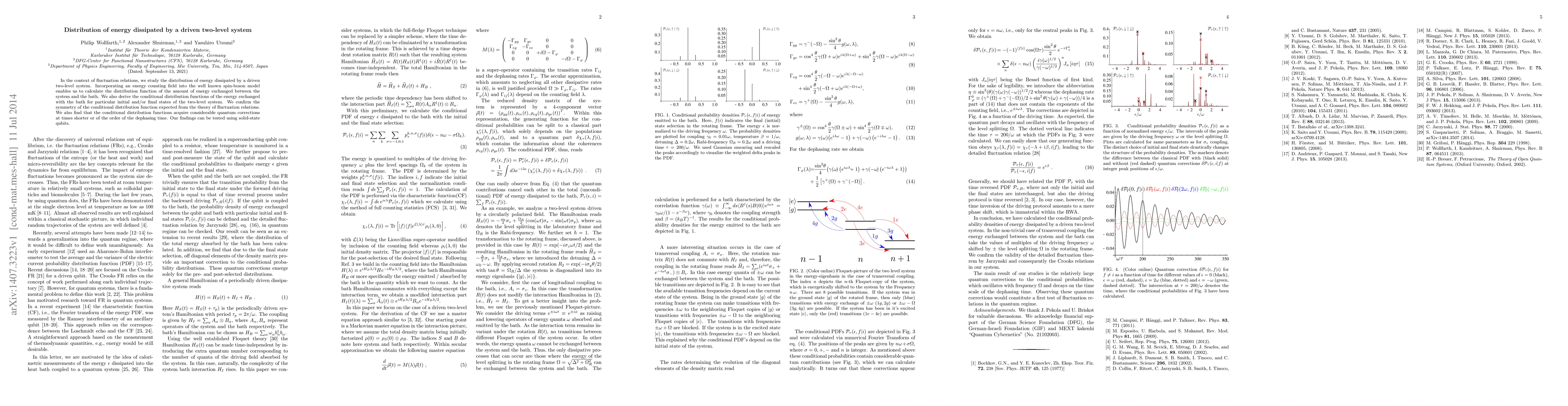 This paper investigates the distribution of energy dissipation in a driven two-level system using the spin-boson model with an energy counting field, deriving conditional distribution functions for specific initial/final states and confirming theoretical symmetry. Quantum corrections are significant at short times, relevant for testing with solid-state qubits.