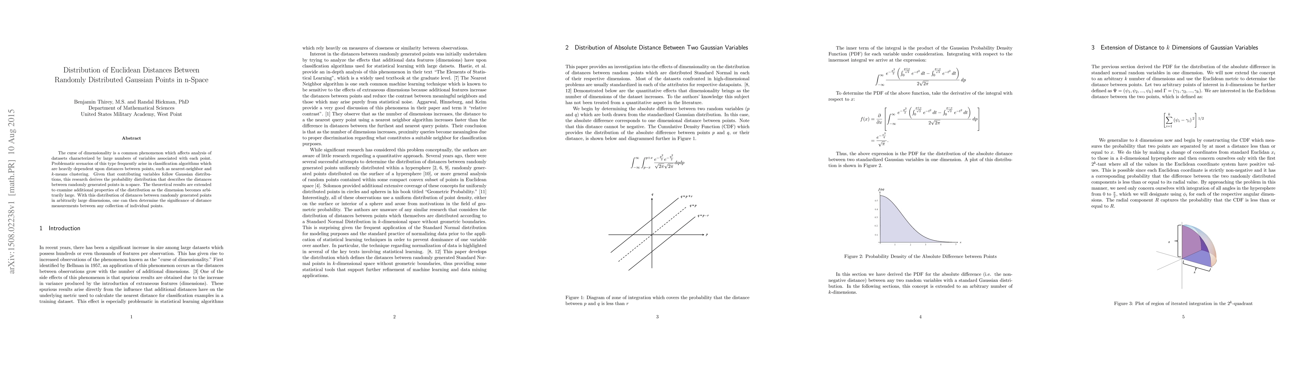 The curse of dimensionality is a common phenomenon which affects analysis of datasets characterized by large numbers of variables associated with each point. Problematic scenarios of this type frequently arise in classification algorithms which are heavily dependent upon distances between points, such as nearest-neighbor and $k$-means clustering. Given that contributing variables follow Gaussian distributions, this research derives the probability distribution that describes the distances between randomly generated points in n-space. The theoretical results are extended to examine additional properties of the distribution as the dimension becomes arbitrarily large. With this distribution of distances between randomly generated points in arbitrarily large dimensions, one can then determine the significance of distance measurements between any collection of individual points.