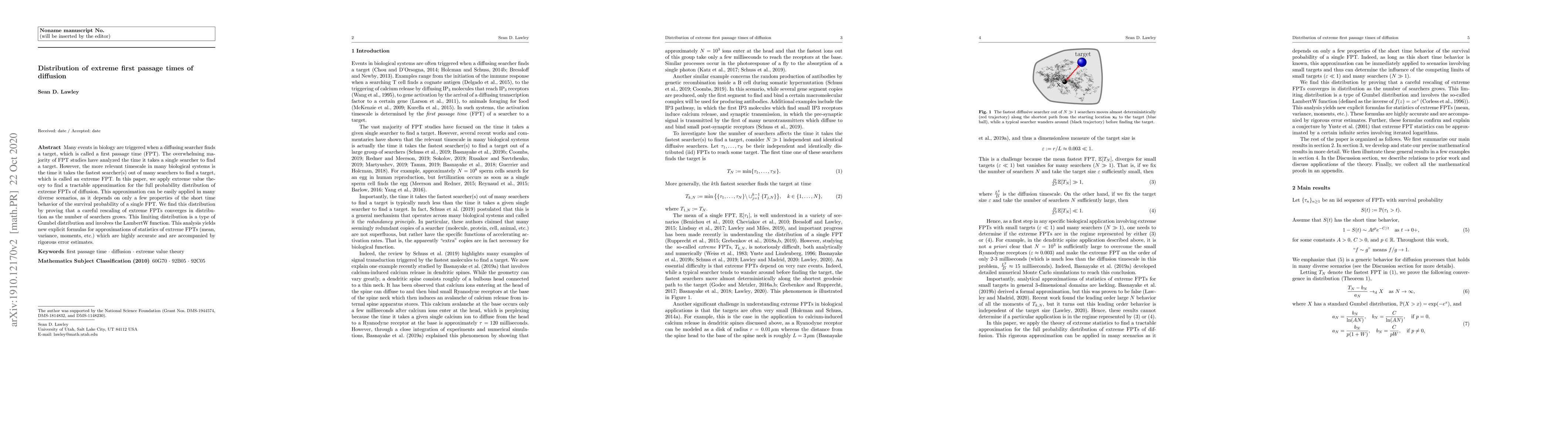 Many events in biology are triggered when a diffusing searcher finds a target, which is called a first passage time (FPT). The overwhelming majority of FPT studies have analyzed the time it takes a single searcher to find a target. However, the more relevant timescale in many biological systems is the time it takes the fastest searcher(s) out of many searchers to find a target, which is called an extreme FPT. In this paper, we apply extreme value theory to find a tractable approximation for the full probability distribution of extreme FPTs of diffusion. This approximation can be easily applied in many diverse scenarios, as it depends on only a few properties of the short time behavior of the survival probability of a single FPT. We find this distribution by proving that a careful rescaling of extreme FPTs converges in distribution as the number of searchers grows. This limiting distribution is a type of Gumbel distribution and involves the LambertW function. This analysis yields new explicit formulas for approximations of statistics of extreme FPTs (mean, variance, moments, etc.) which are highly accurate and are accompanied by rigorous error estimates.