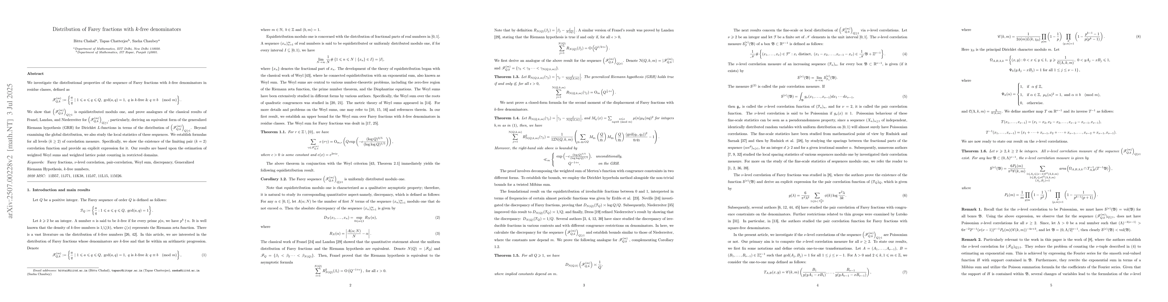 We investigate the distributional properties of the sequence of Farey fractions with $k$-free denominators in residue classes, defined as \[\mathscr{F}_{Q,k}^{(m)}:=\left\{\frac{a}{q}\ |\ 1\leq a\leq q\leq Q,\ \gcd(a,q)=1,\ q\ \text{is}\ k\text{-free}\ \&\ q\equiv b\pmod{m} \right\}.\] We show that $\left(\mathscr{F}_{Q,k}^{(m)}\right)_{Q\ge 1}$ is equidistributed modulo one, and prove analogues of the classical results of Franel, Landau, and Niederreiter for $\left(\mathscr{F}_{Q,k}^{(m)}\right)_{Q\ge 1}$, particularly, deriving an equivalent form of the generalized Riemann hypothesis (GRH) for Dirichlet $L$-functions in terms of the distribution of $\left(\mathscr{F}_{Q,k}^{(m)}\right)_{Q\ge 1}$. Beyond examining the global distribution, we also study the local statistics of these sequences. We establish formulas for all levels ($k\ge 2$) of correlation measure. Specifically, we show the existence of the limiting pair ($k=2$) correlation function and provide an explicit expression for it. Our results are based upon the estimation of weighted Weyl sums and weighted lattice point counting in restricted domains.