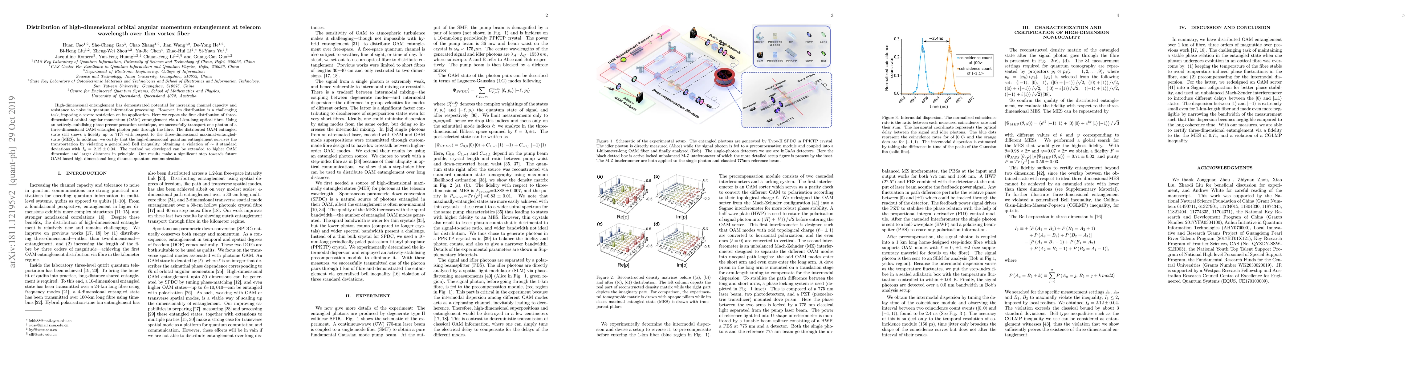 This paper reports the first distribution of three-dimensional orbital angular momentum entanglement over 1 km of optical fibre, achieving a fidelity of 71% and demonstrating the survival of high-dimensional quantum entanglement via a generalized Bell inequality violation. The method can potentially extend to higher dimensions and longer distances.