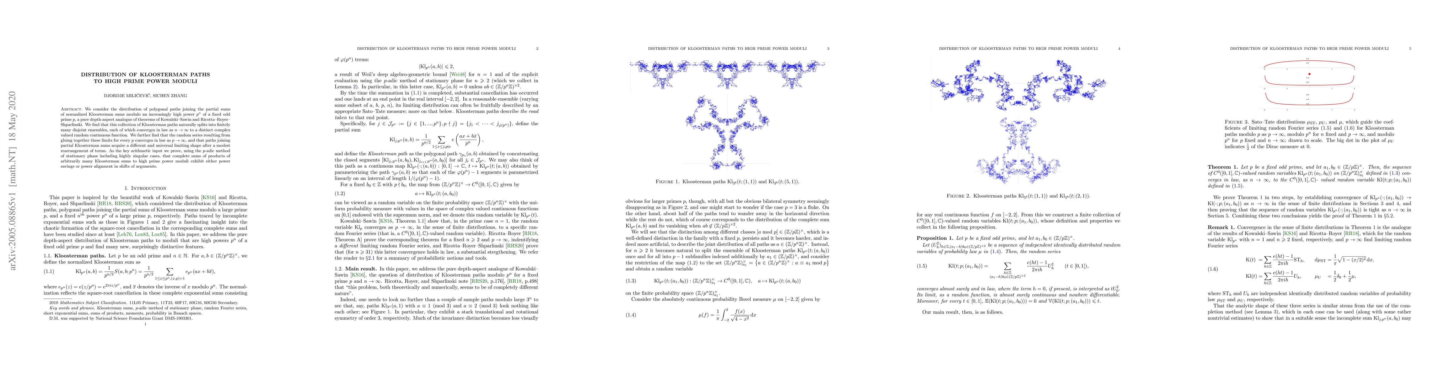 This paper studies the distribution of polygonal paths formed by partial sums of normalized Kloosterman sums modulo high prime power moduli, showing they split into distinct ensembles converging to complex random functions. It proves that these paths exhibit universal limiting shapes after rearrangement and that complete sums of Kloosterman products display power savings or alignment through p-adic stationary phase methods.