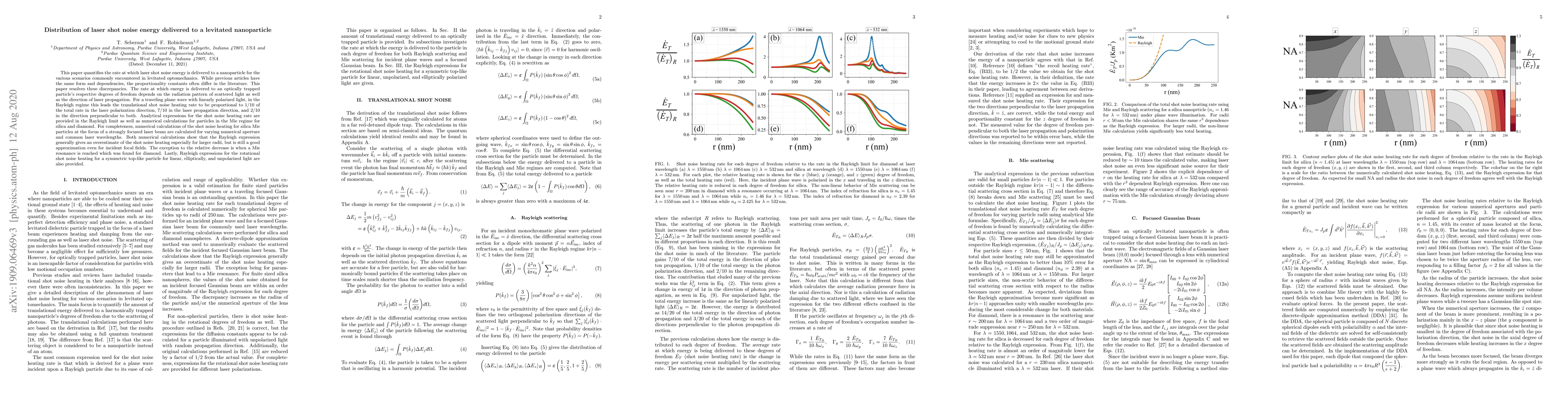 This paper quantifies laser shot noise energy delivery to levitated nanoparticles, resolving discrepancies in proportionality constants. Analytical and numerical results show that the energy distribution depends on the radiation pattern and laser propagation direction, with the Rayleigh regime providing a good approximation for most cases, except near Mie resonances.