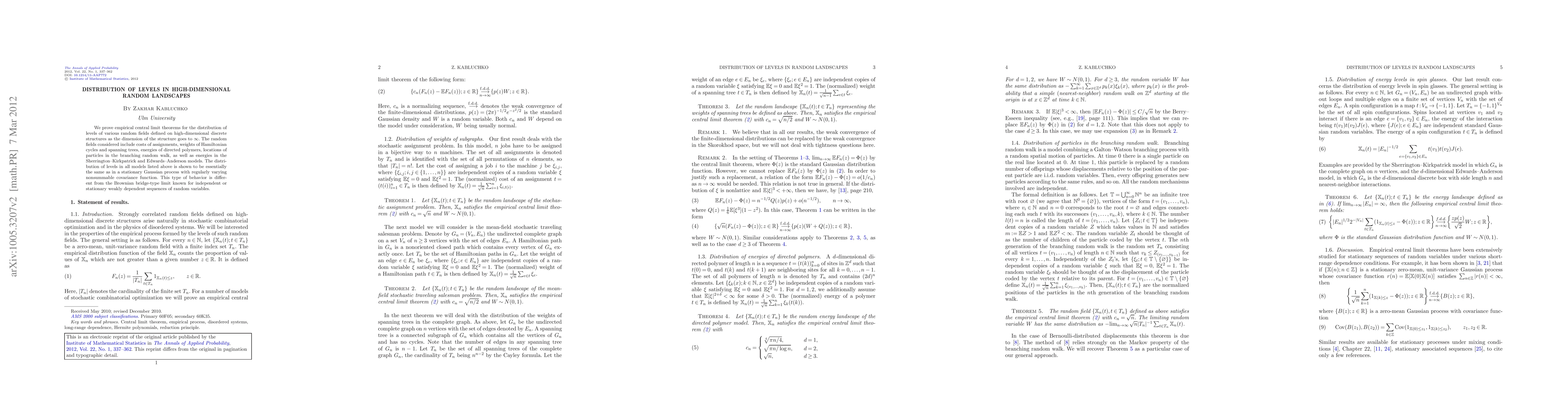 We prove empirical central limit theorems for the distribution of levels of various random fields defined on high-dimensional discrete structures as the dimension of the structure goes to $\infty$. The random fields considered include costs of assignments, weights of Hamiltonian cycles and spanning trees, energies of directed polymers, locations of particles in the branching random walk, as well as energies in the Sherrington--Kirkpatrick and Edwards--Anderson models. The distribution of levels in all models listed above is shown to be essentially the same as in a stationary Gaussian process with regularly varying nonsummable covariance function. This type of behavior is different from the Brownian bridge-type limit known for independent or stationary weakly dependent sequences of random variables.